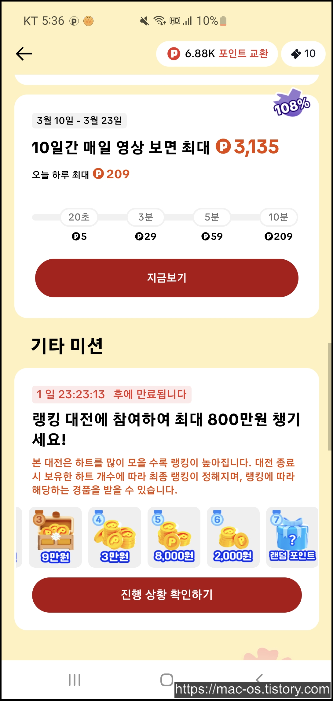 10일 간 매일 영상 보면 최대 3135원, 오늘 하루 최대 209원을 적립받을 수 있습니다. 그리고 3월 8일부터 3월 10일간 같은 일일 미션이어도 포인트의 획득 비율이 증가하는 경우도 있구요. 오른쪽 사진의 영어로 된 미션을 보면 게시글을 작성해서 좋아요 500개를 받으면 최대 1만 5천원을 준다고 하네요.
