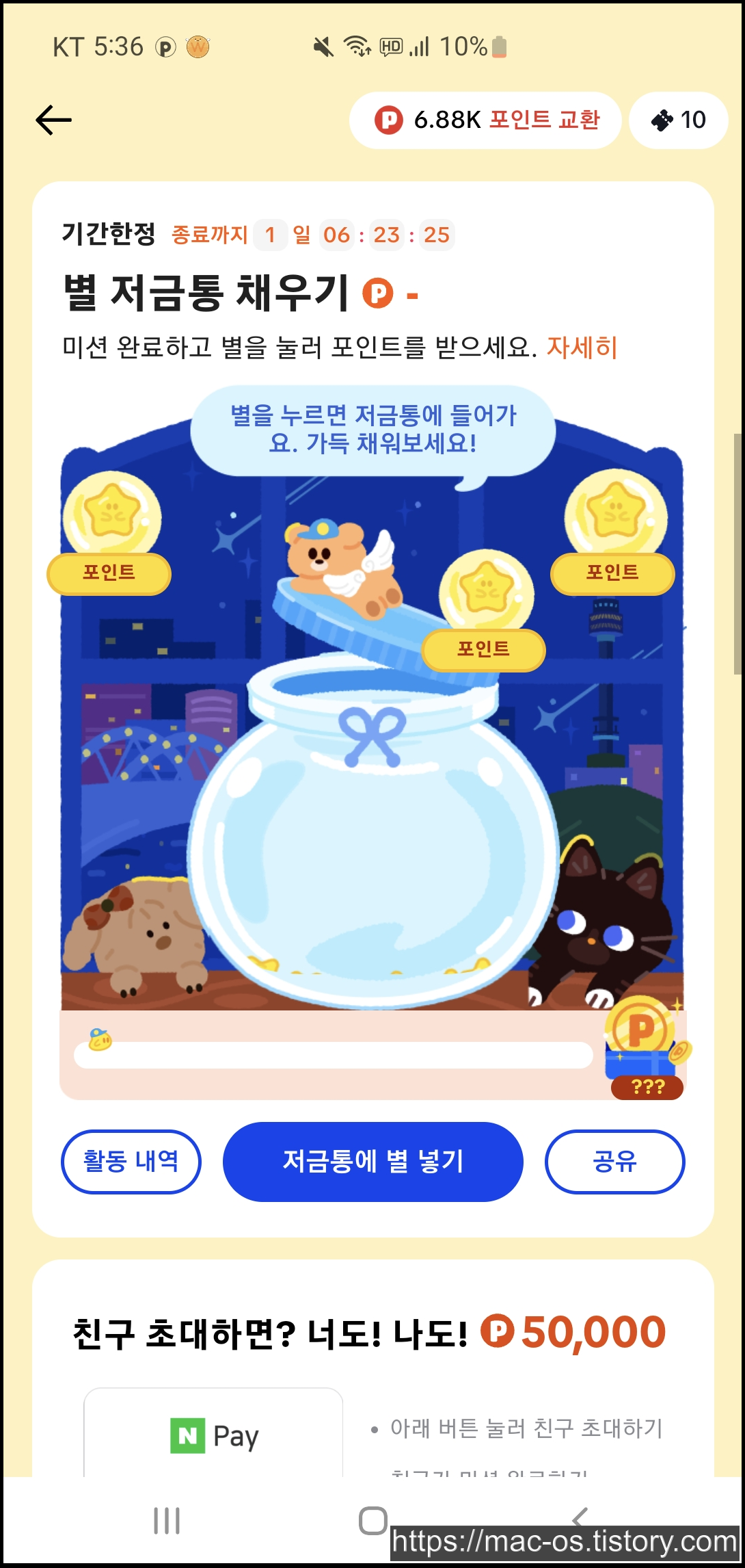이벤트를 불시에 진행되며, 종료일은 이벤트 페이지의 카운트다운에서 확인이 가능합니다. 반짝이는 별을 모아 별 저금통을 가득 채우면 포인트를 획득하게 되고, 저금통을 얼마나 채웠는지에 따라 받을 수 있는 포인트가 달라집니다. 이벤트 기간 동안 최대 50개의 별 저금통을 채울 수 있습니다. 한 번에 최대 3개의 별이 나타나며, 각 별은 특정 미션을 가지고 있습니다.