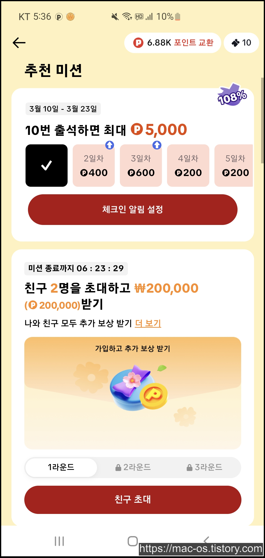 틱톡 라이트를 설치한 적이 없거나 지난 7일 동안 앱을 열어본 적 없는 유저를 초대하고, 초대받은 친구가 10일 연속 출석 미션을 완료하면 포인트를 지급합니다. 라운드별 보상이 20만원/25만원/30만원이고, 각 라운드에서 목표 친구 수를 달성하면 보너스 포인트를 받을 수 있습니다. 이 이벤트의 링크를 통해 가입하는 경우 신규 회원은 5000원만 받을 수 있고, 초대자는 라운드 미션을 완료하면 20만원 상당의 포인트를 받게되니 신규회원에게는 그다지 좋은 이벤트는 아닙니다. 제가 처음에 소개한 링크로 가입하면 신규회원도 5만원을 받을 수 있습니다.