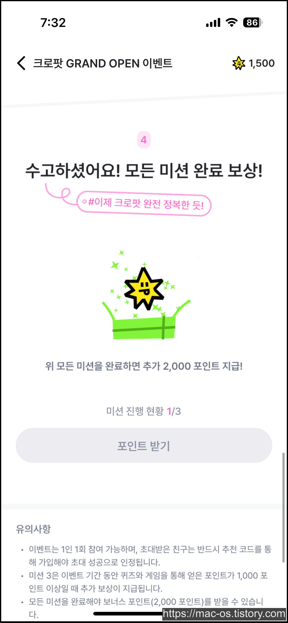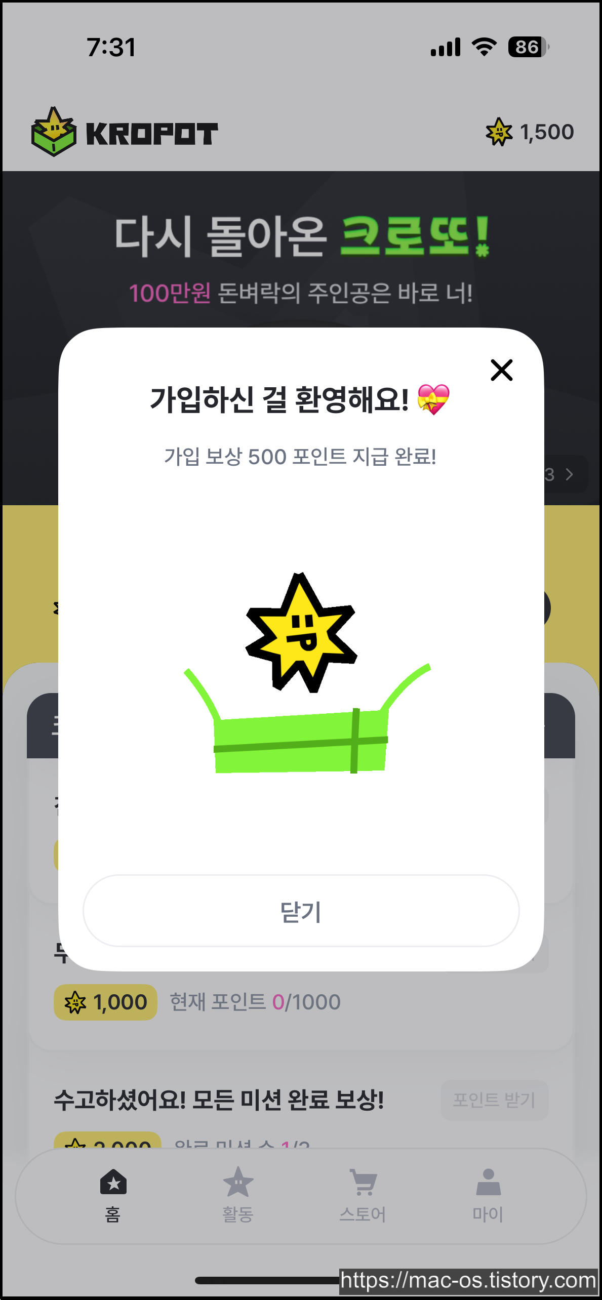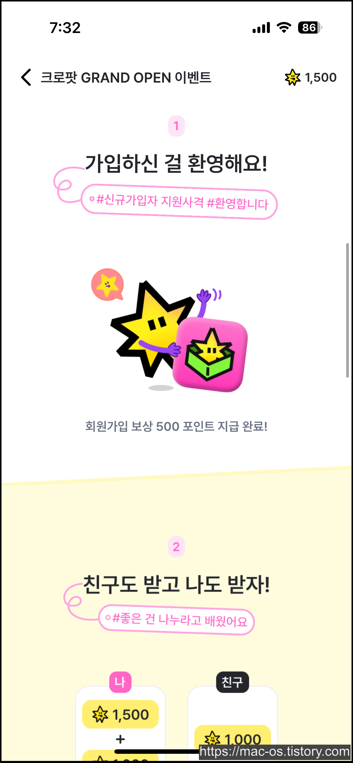 회원가입을 마치면 가입 보상으로 500포인트, 초대코드 가입자 보상으로 1000포인트로 시작하게 됩니다.