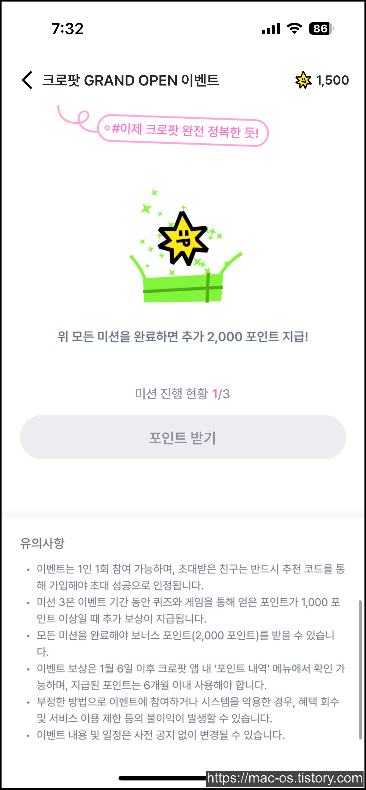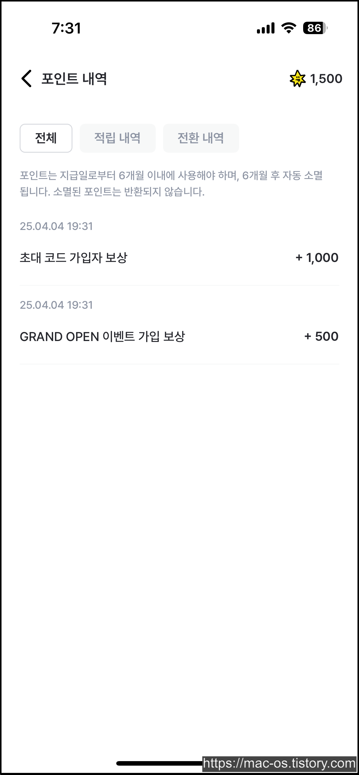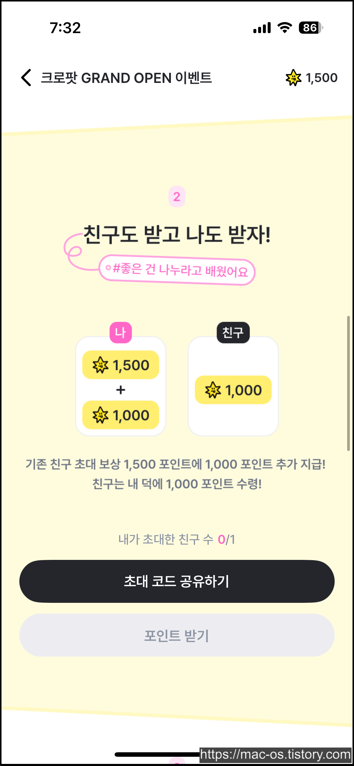 회원가입을 마치면 가입 보상으로 500포인트, 초대코드 가입자 보상으로 1000포인트로 시작하게 됩니다.