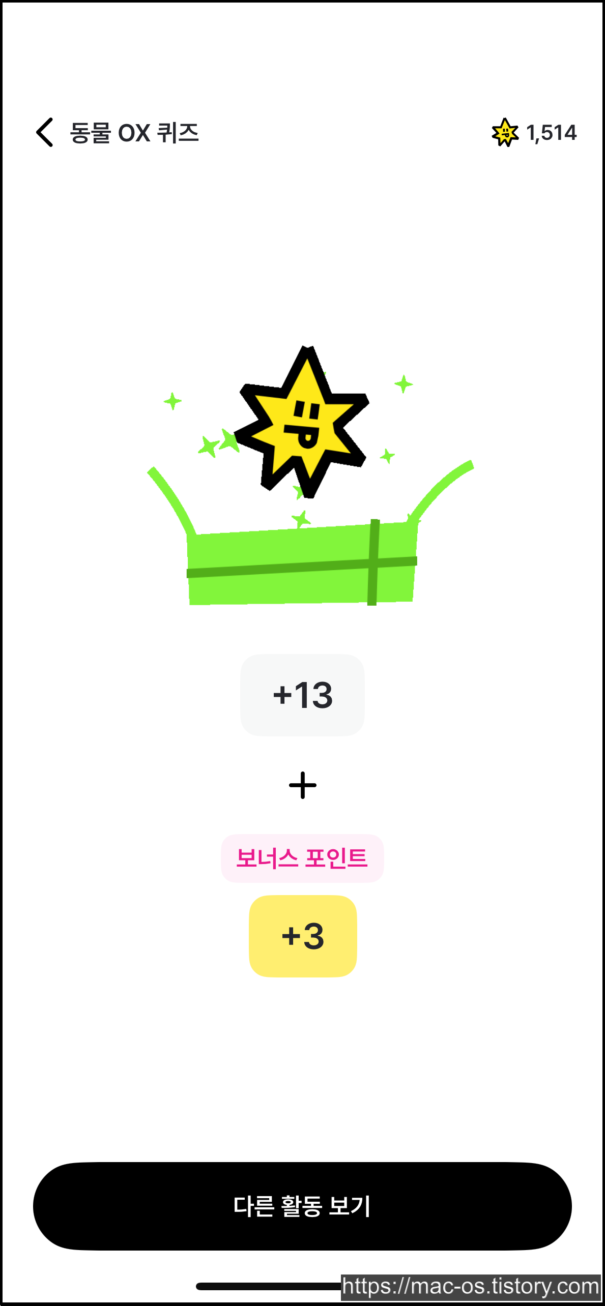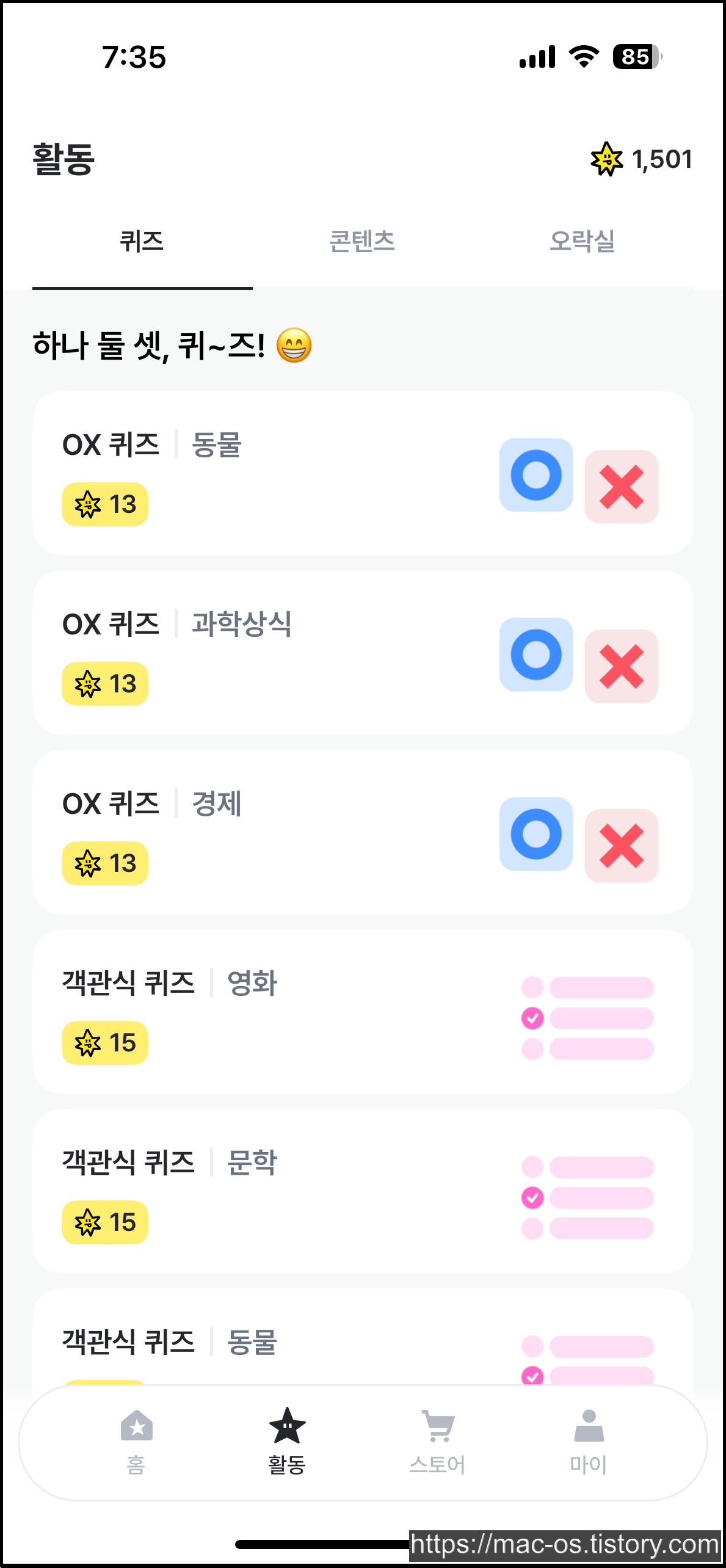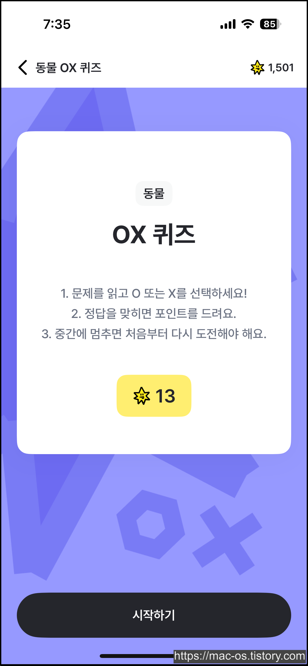 활동 페이지로 이동하면 퀴즈, 콘텐츠, 오락실에서 포인트를 얻을 수 있습니다. OX퀴즈는 문제를 읽고 O 또는 X를 선택한 다음, 정답을 맞히면 포인트를 받을 수 있습니다. 중간에 멈추면 처음부터 다시 도전해야 합니다.