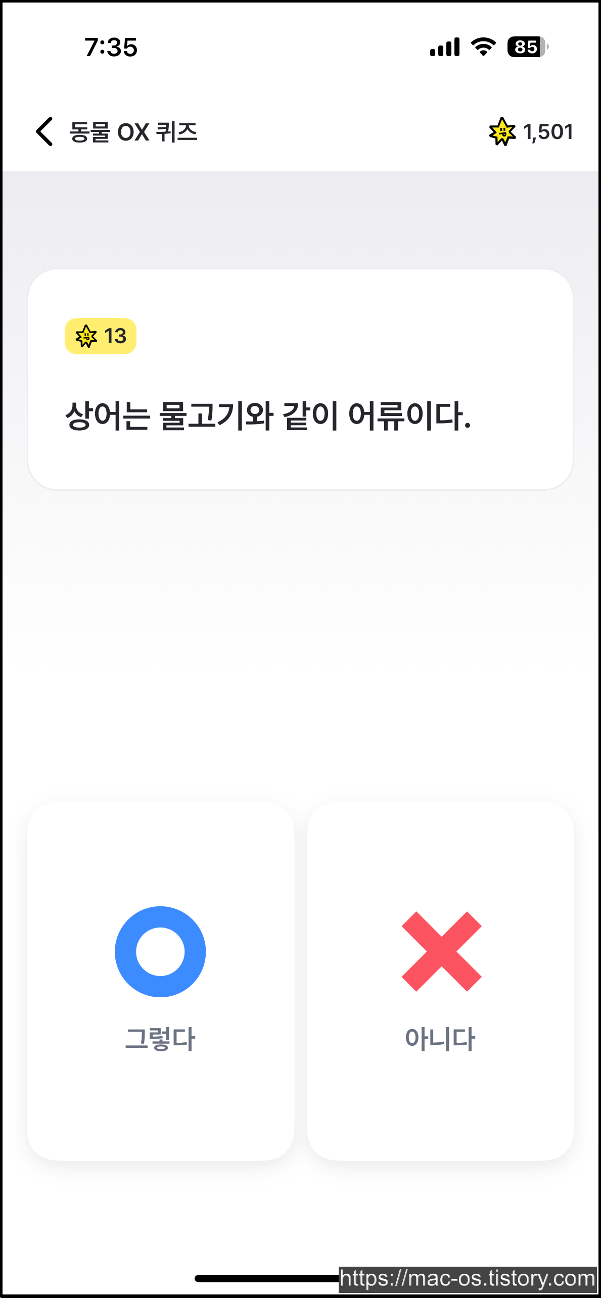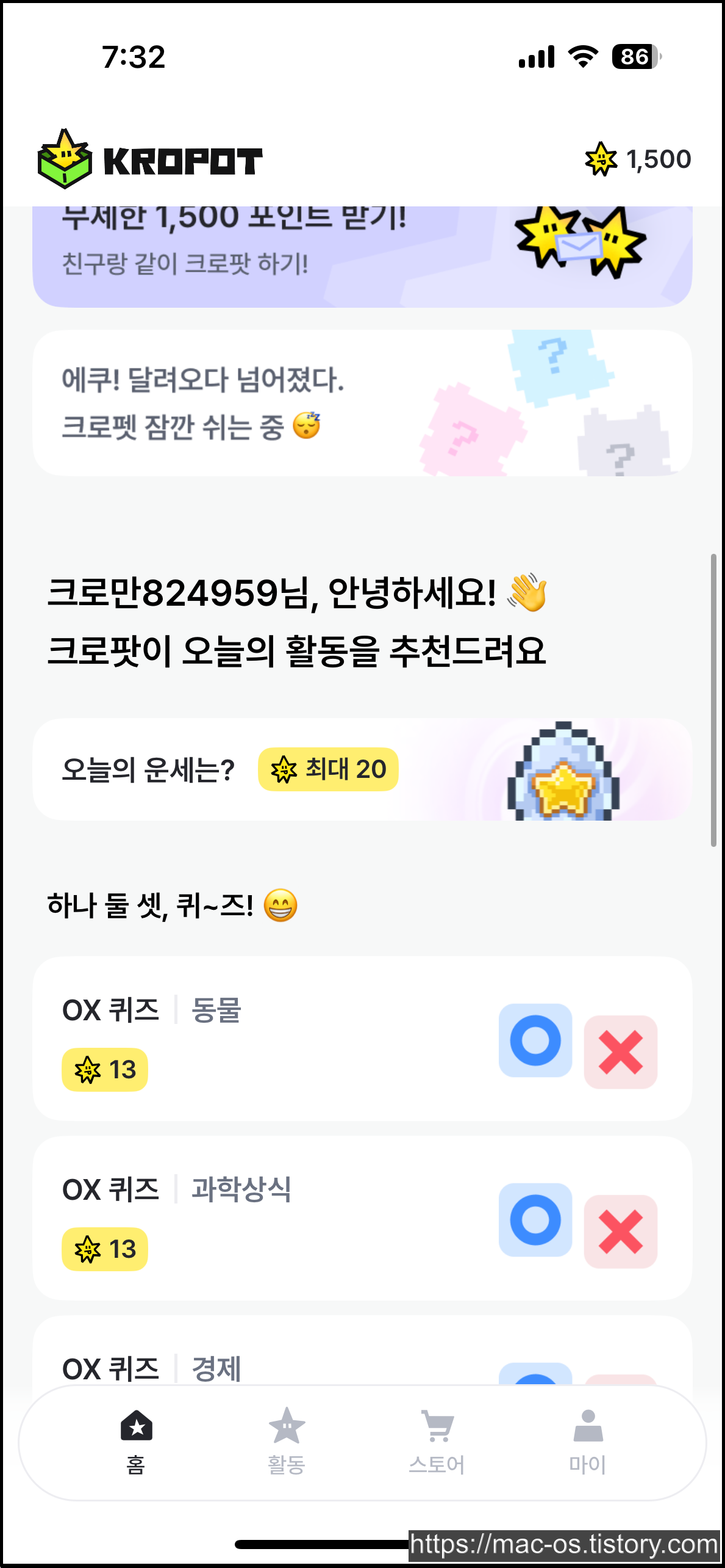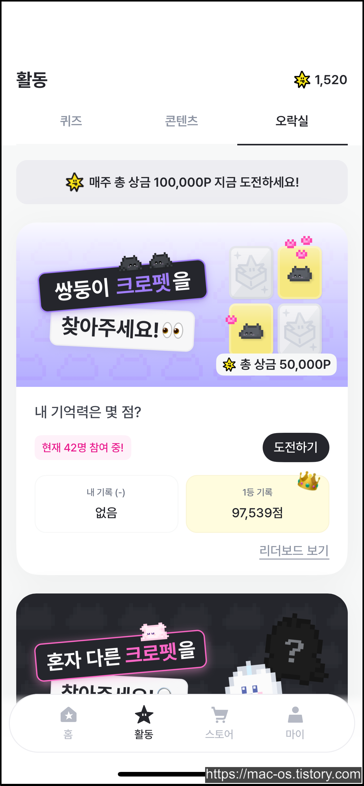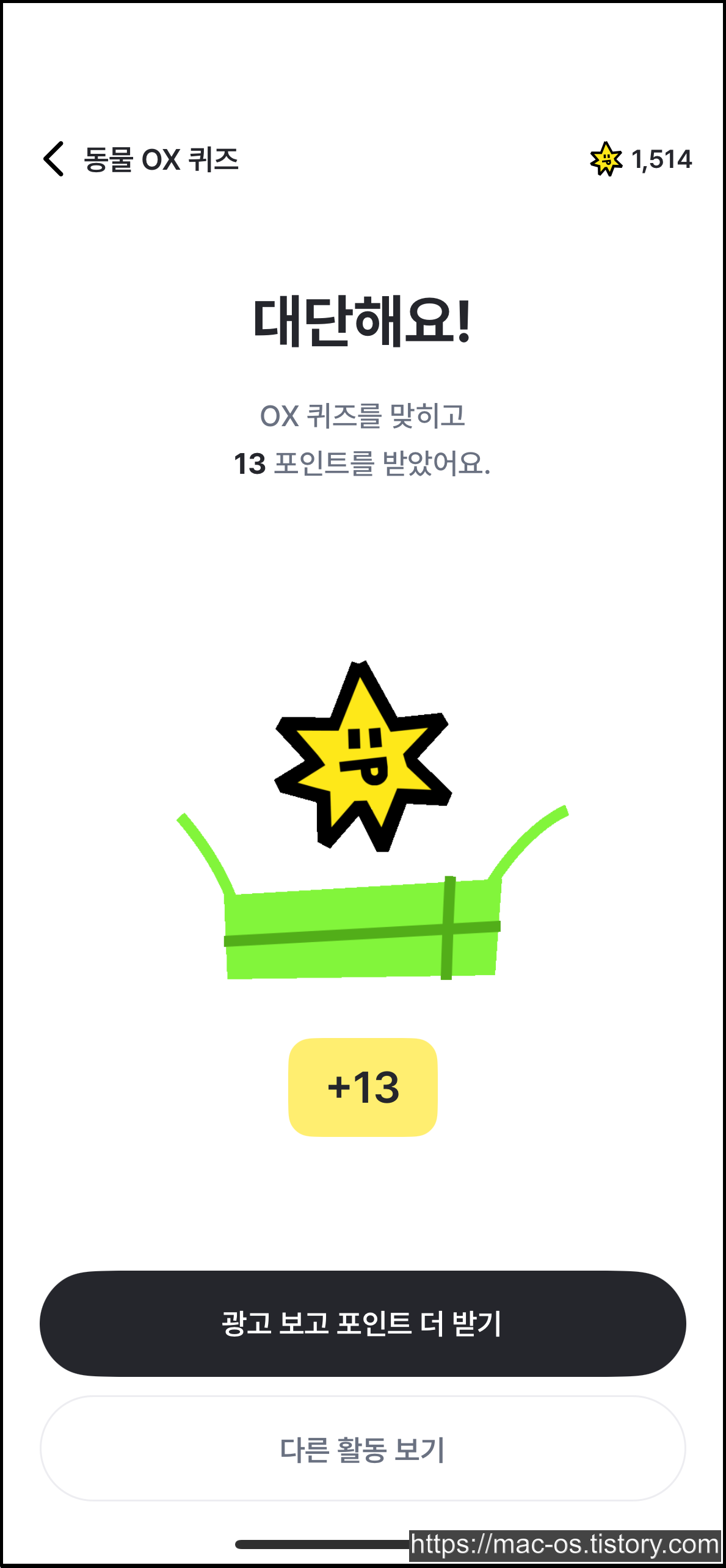 활동 페이지로 이동하면 퀴즈, 콘텐츠, 오락실에서 포인트를 얻을 수 있습니다. OX퀴즈는 문제를 읽고 O 또는 X를 선택한 다음, 정답을 맞히면 포인트를 받을 수 있습니다. 중간에 멈추면 처음부터 다시 도전해야 합니다.