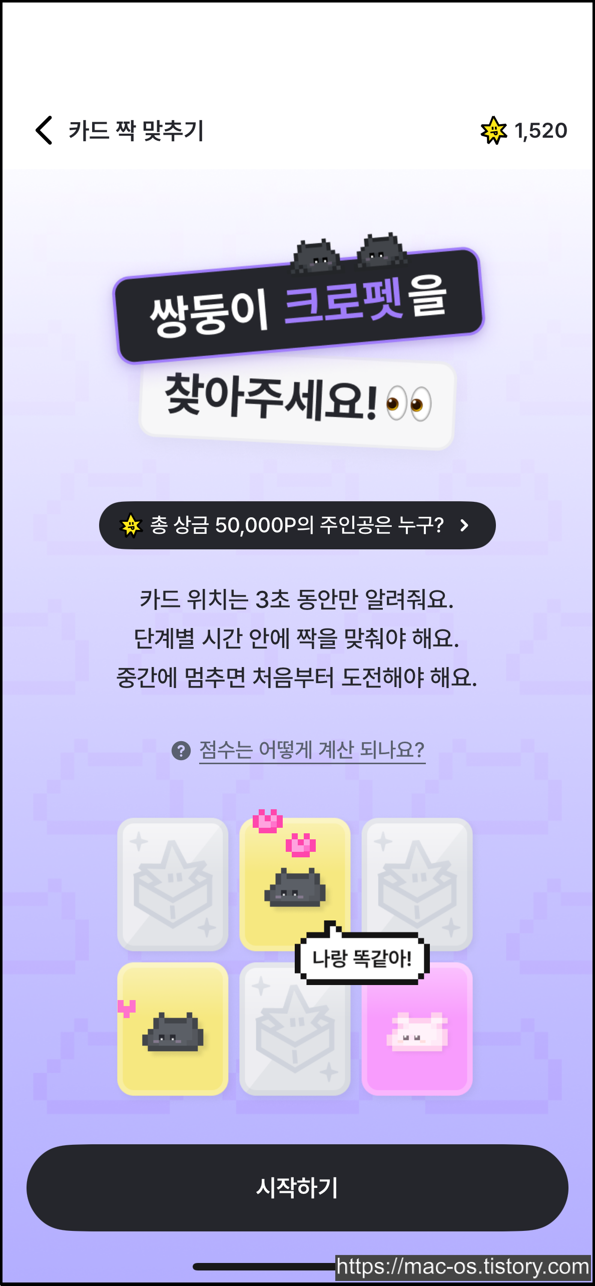 처음에 시작하기 버튼을 누르면 모든 카드의 위치를 3초동안 알려주고, 사용자는 그걸 기억했다가 제한시간 내에 카드의 짝을 맞추면 됩니다. 총 상금 5만 포인트가 걸려있는데 아마 순위별로 차등 보상이 있는 듯하네요.