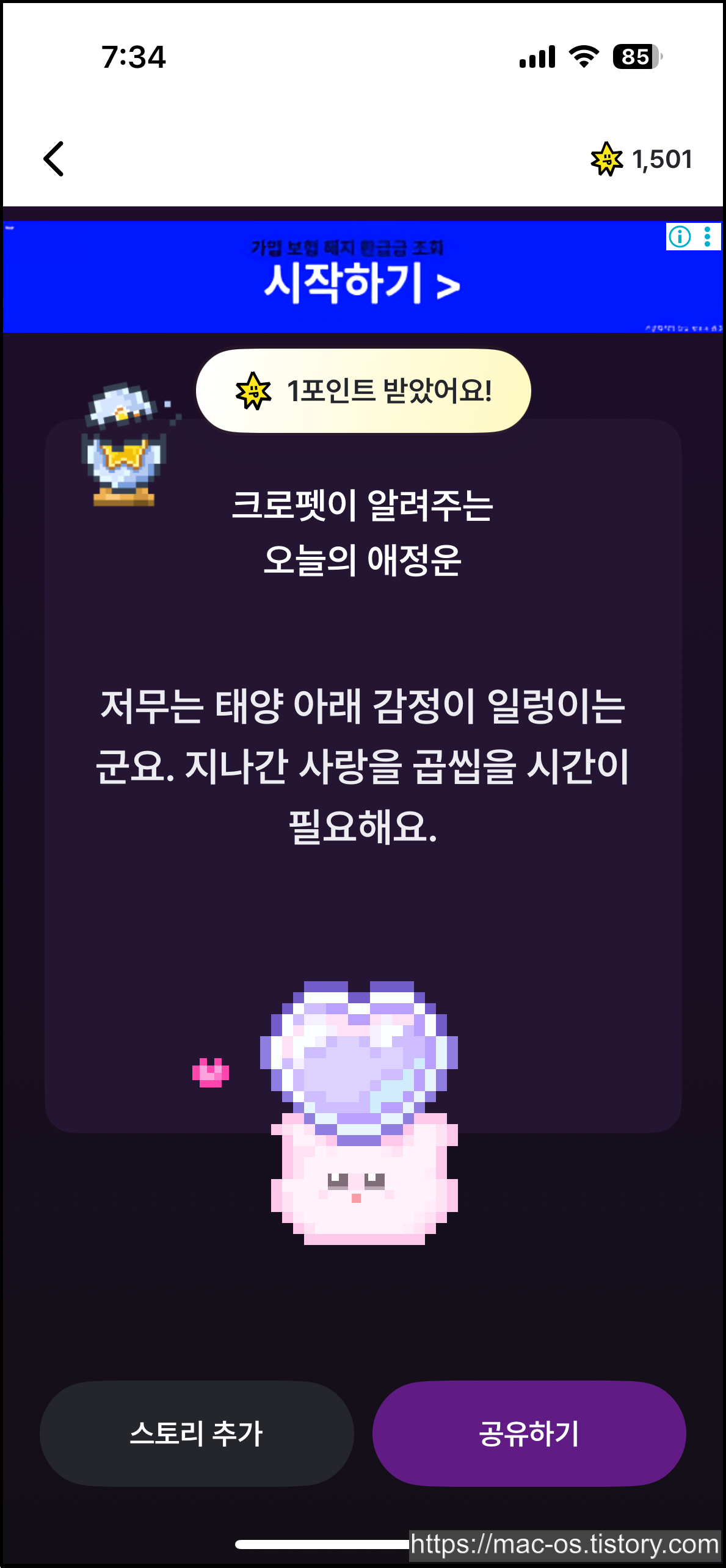 홈 화면에서 아래로 스크롤을 좀 내리면 오늘의 운세 배너가 있는데 이걸 눌러서 30초 광고 영상을 시청하면 운세를 보면서 최대 20포인트까지 얻을 수 있습니다. 저는 1포인트가 나왔네요.