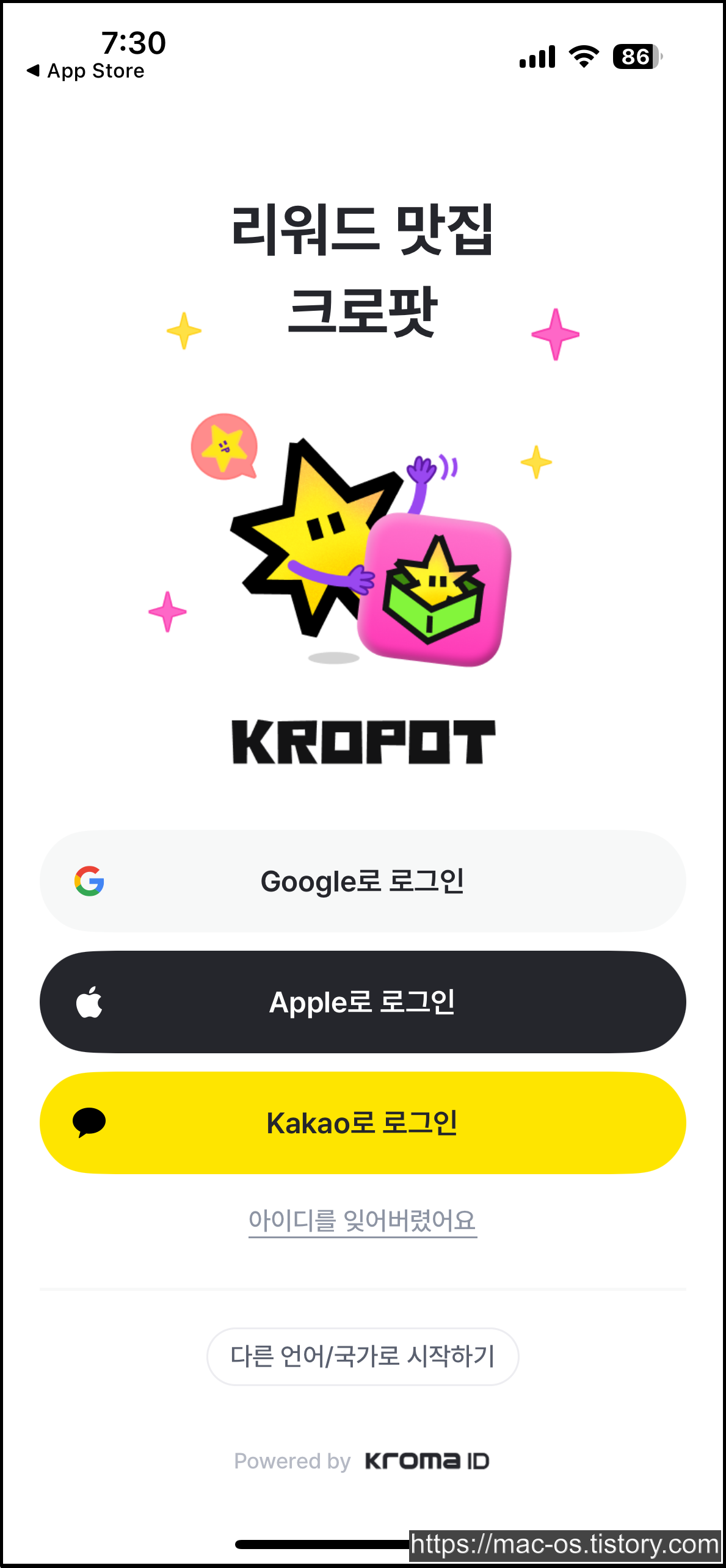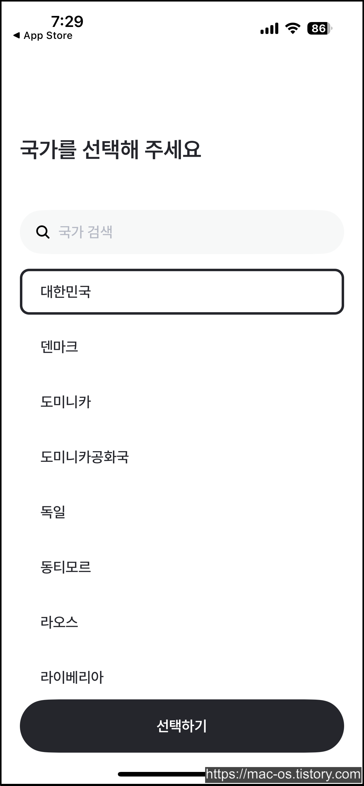 국가를 선택하고 구글, 애플, 카카오톡 계정 중에서 하나를 골라 로그인합니다.