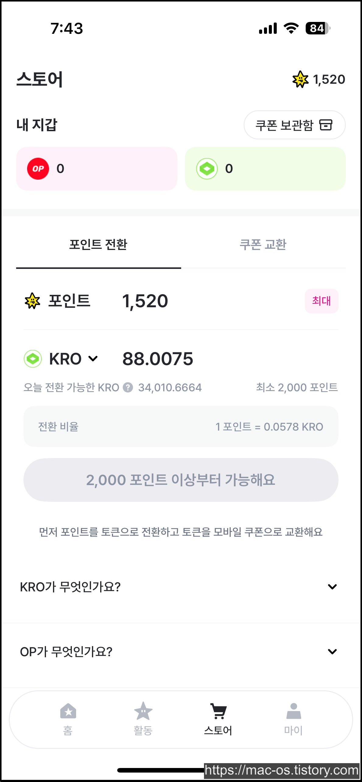 크로팟에서 얻은 포인트는 스토어 페이지에서 포인트를 OP와 KRO라는 토큰으로 전환하여 현금처럼 사용할 수 있습니다. 그래서 OP와 KRO 어느 것으로 전환해야 이득인지는 아래에서 자세히 설명하겠습니다.