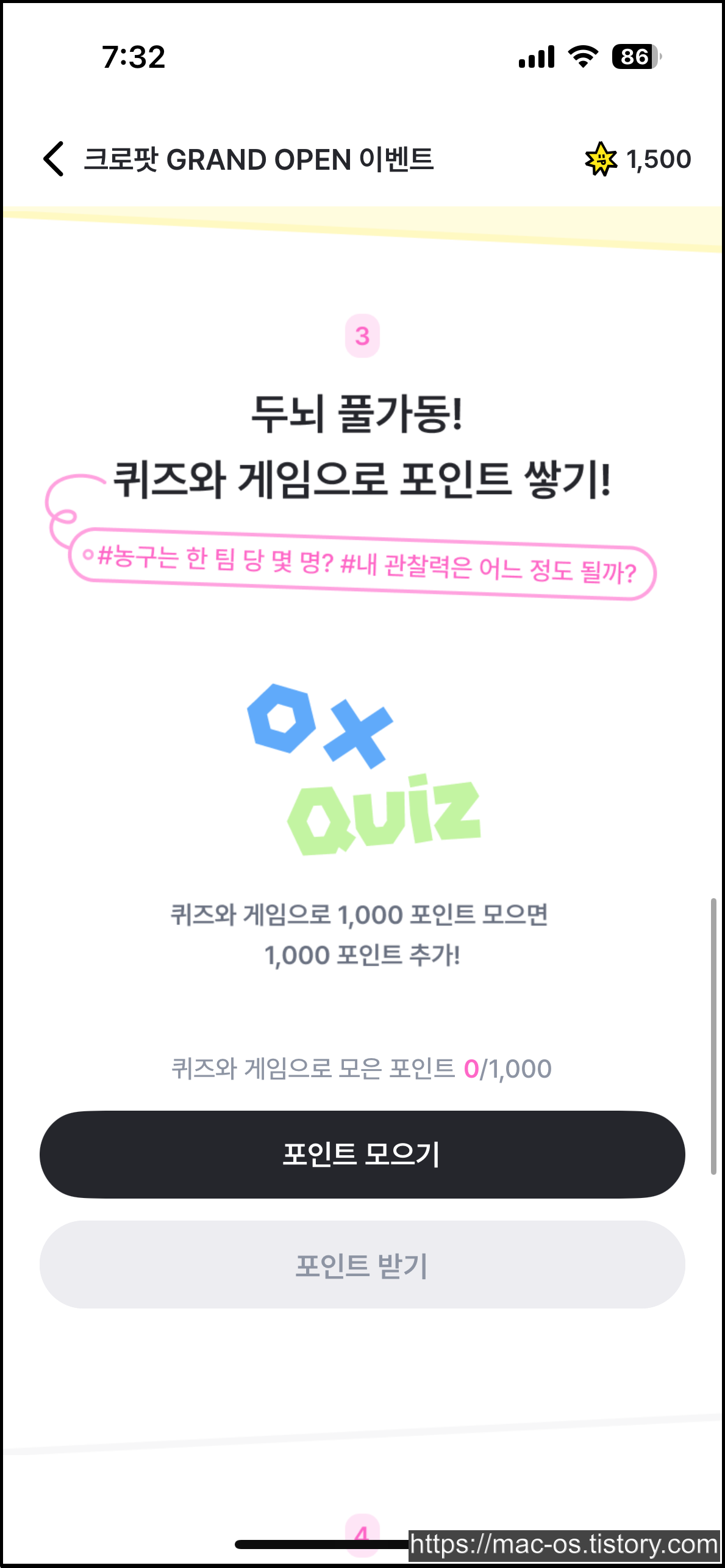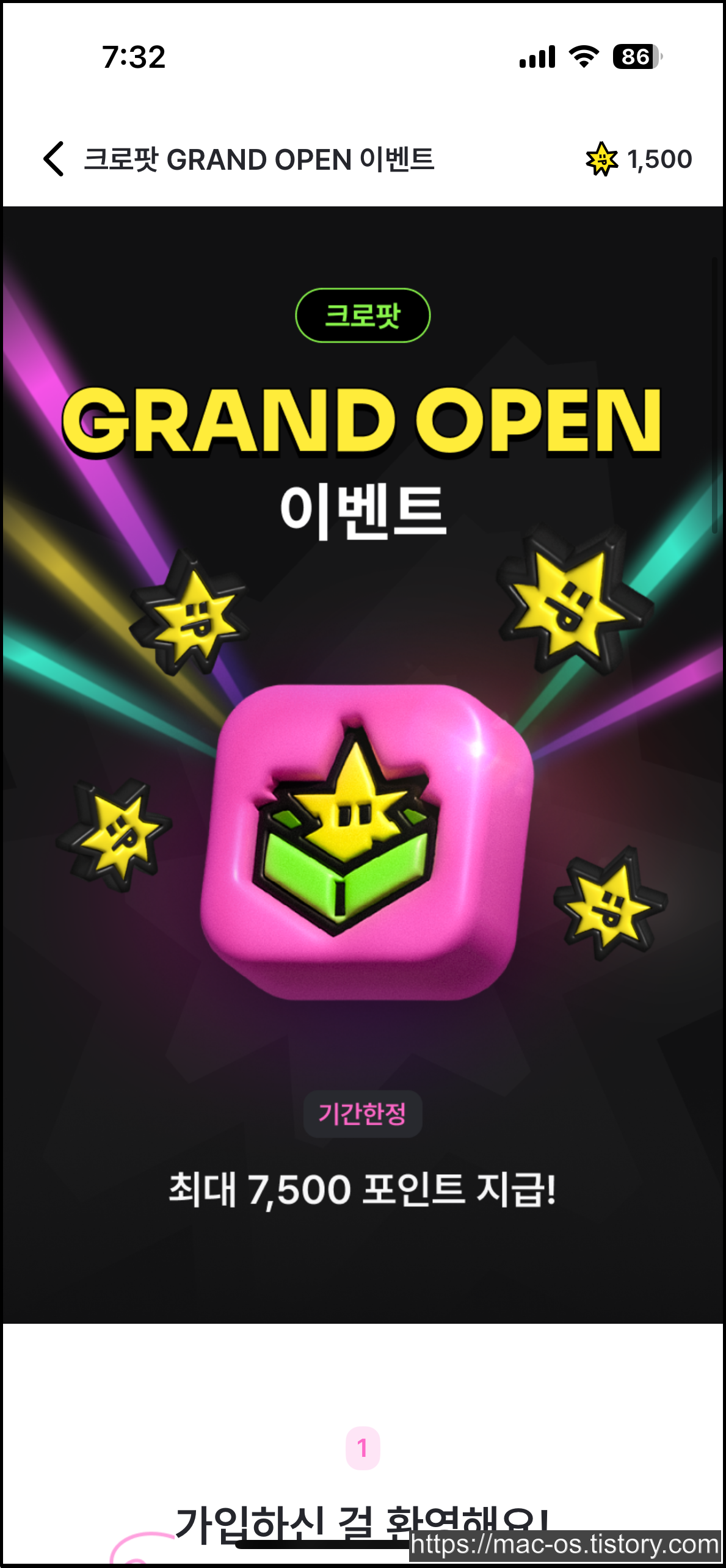 크로팟은 지금 그랜드 오픈이라는 이벤트를 진행하고 있습니다. 이것부터 소개해보겠습니다. 회원가입하면 500포인트 주는건 빠르게 넘어가겠습니다.
