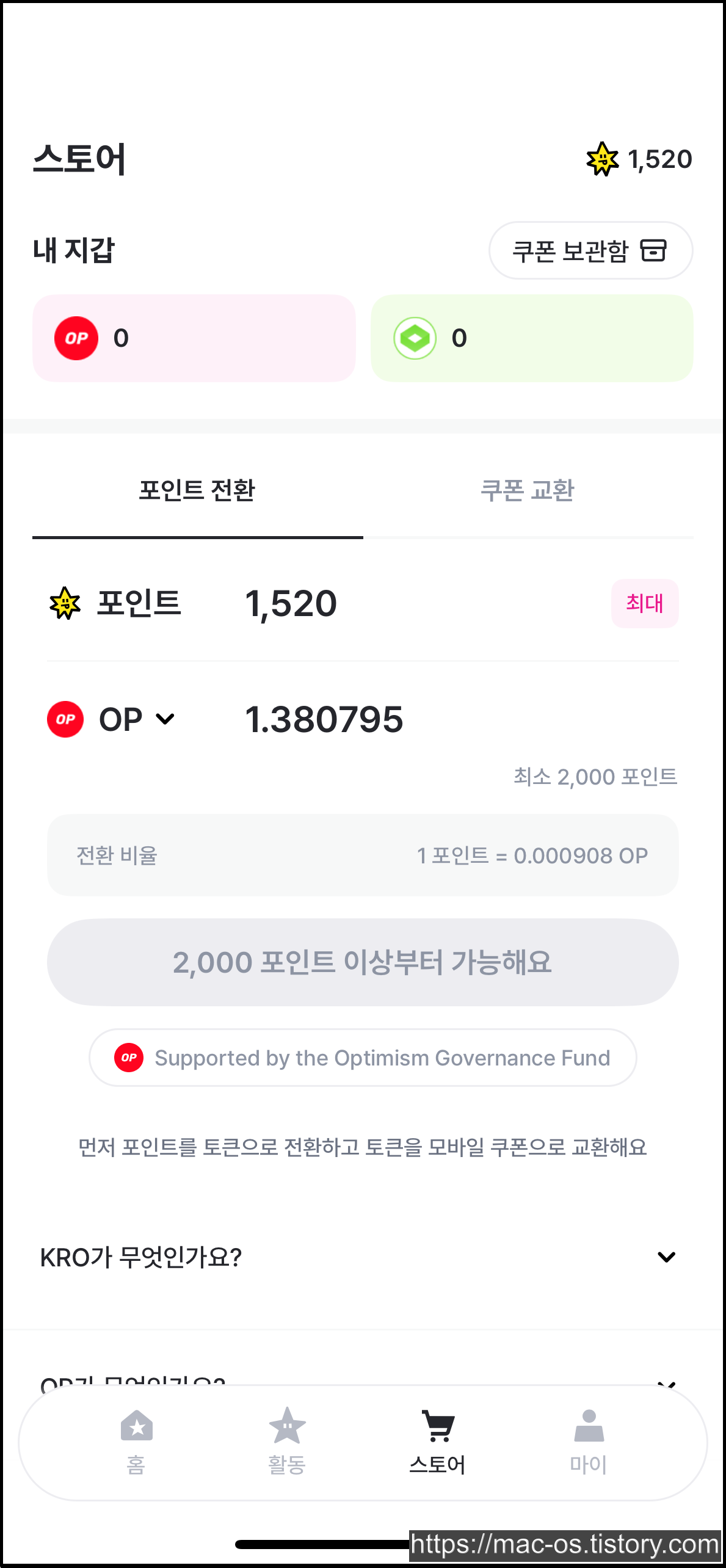 - 포인트는 OP, KRO라는 토큰으로 전환해 스토어에서 기프티콘 및 상품권을 구매하는 용도로 사용할 수 있음