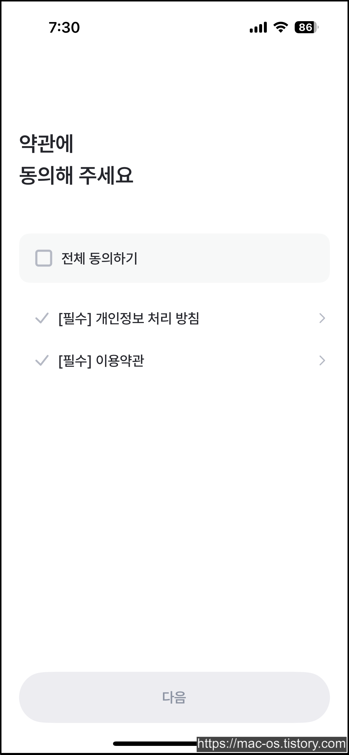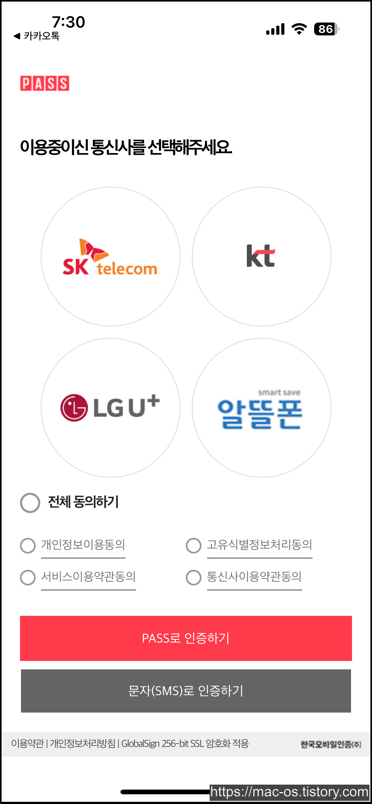 PASS 본인인증을 마치면 개인정보 처리 방침과 이용약관에 동의하는 페이지가 나옵니다.
