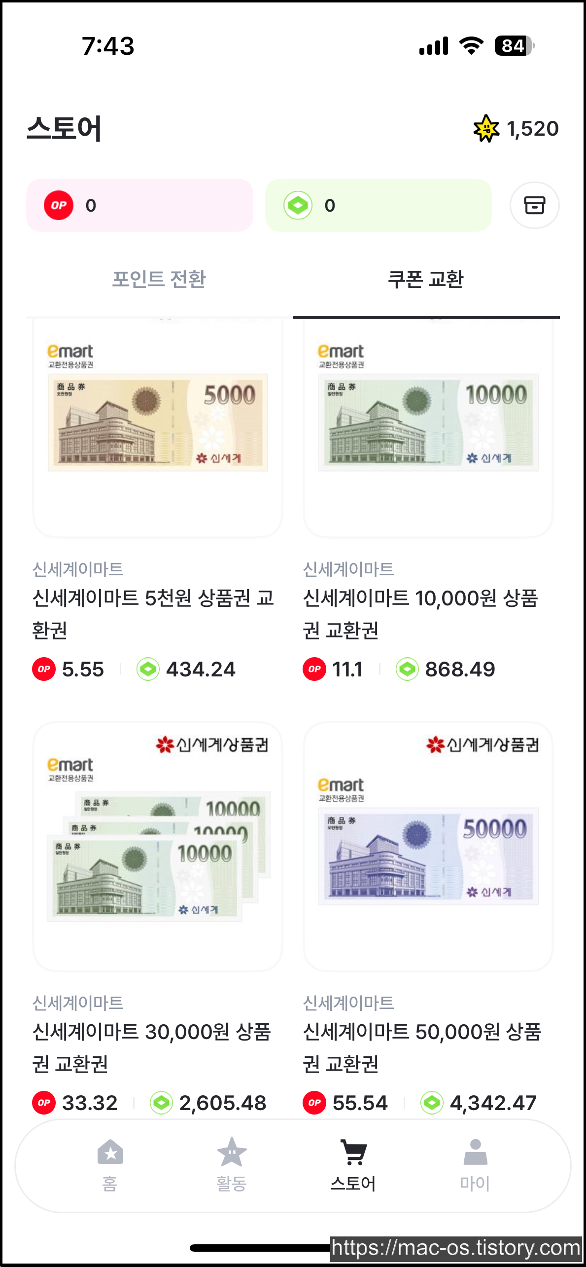 스토어에서 판매 중인 신세계이마트 5천원 상품권의 경우, 구매에 필요한 금액은 OP 기준 5.55OP, KRO 기준 434.24KRO입니다.