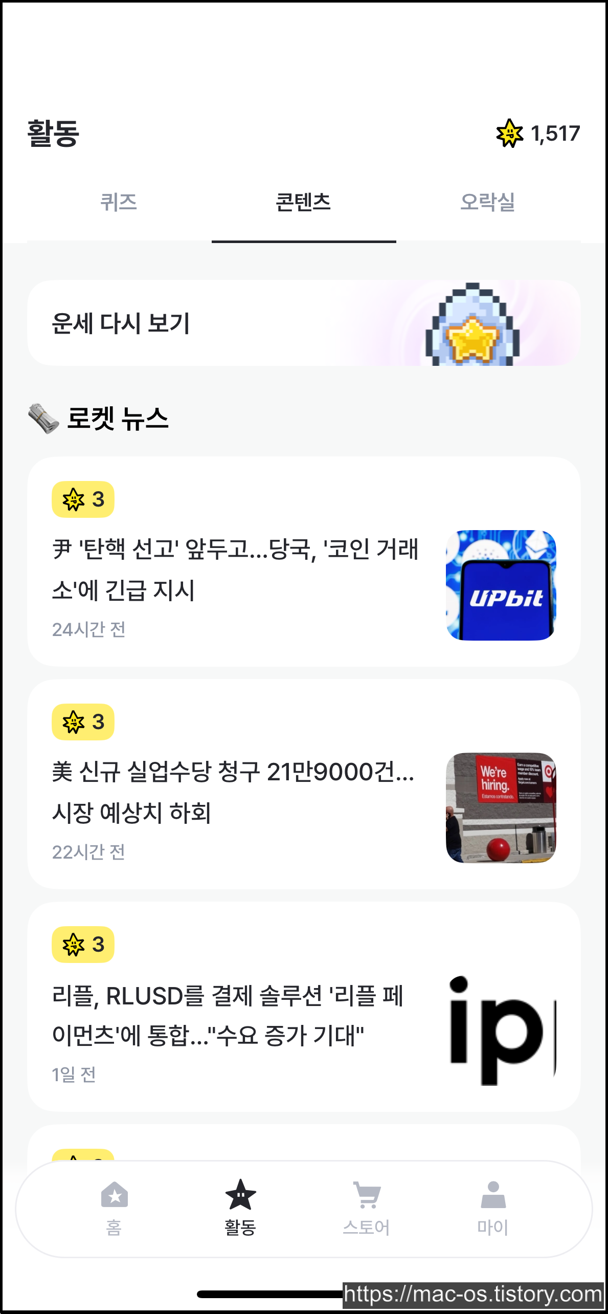 콘텐츠 탭을 보면 로켓 뉴스라고 뉴스가 여러개 있는데요. 매일 엄선된 뉴스를 10초 이상 읽으면 포인트를 받을 수 있습니다.