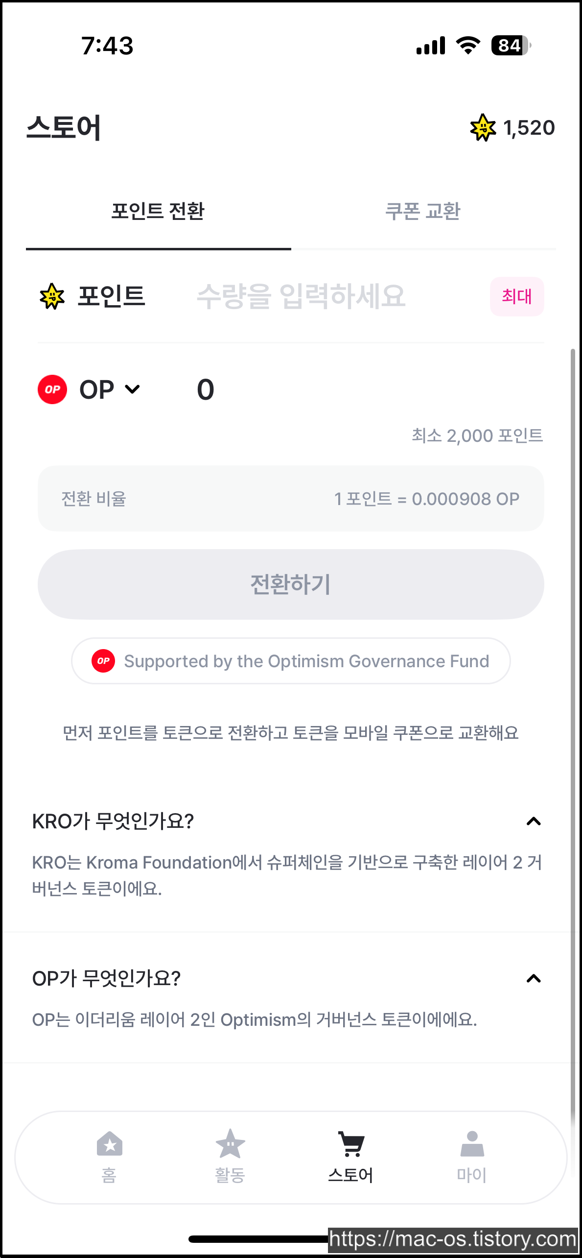 1520포인트를 기준으로 살펴보면, OP로 전환했을 때는 1.380795OP, KRO로 전환했을 때는 88.0075KRO를 받을 수 있습니다.