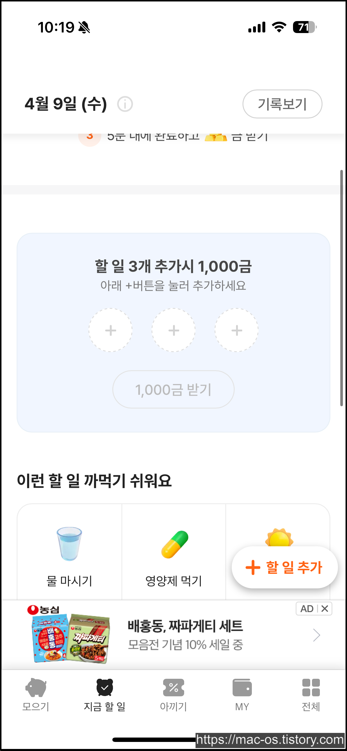 지금 할 일 탭에서 물 마시기, 영양제 먹기 등과 같은 할 일을 3개 추가하면 1000금을 받을 수 있습니다. 그리고 매일 해야할 일을 시간에 맞춰 알림 설정해 둔다면 그 시간에 앱에 접속하여 [밀어서 완료]를 눌러 5금을 얻을 수 있습니다.