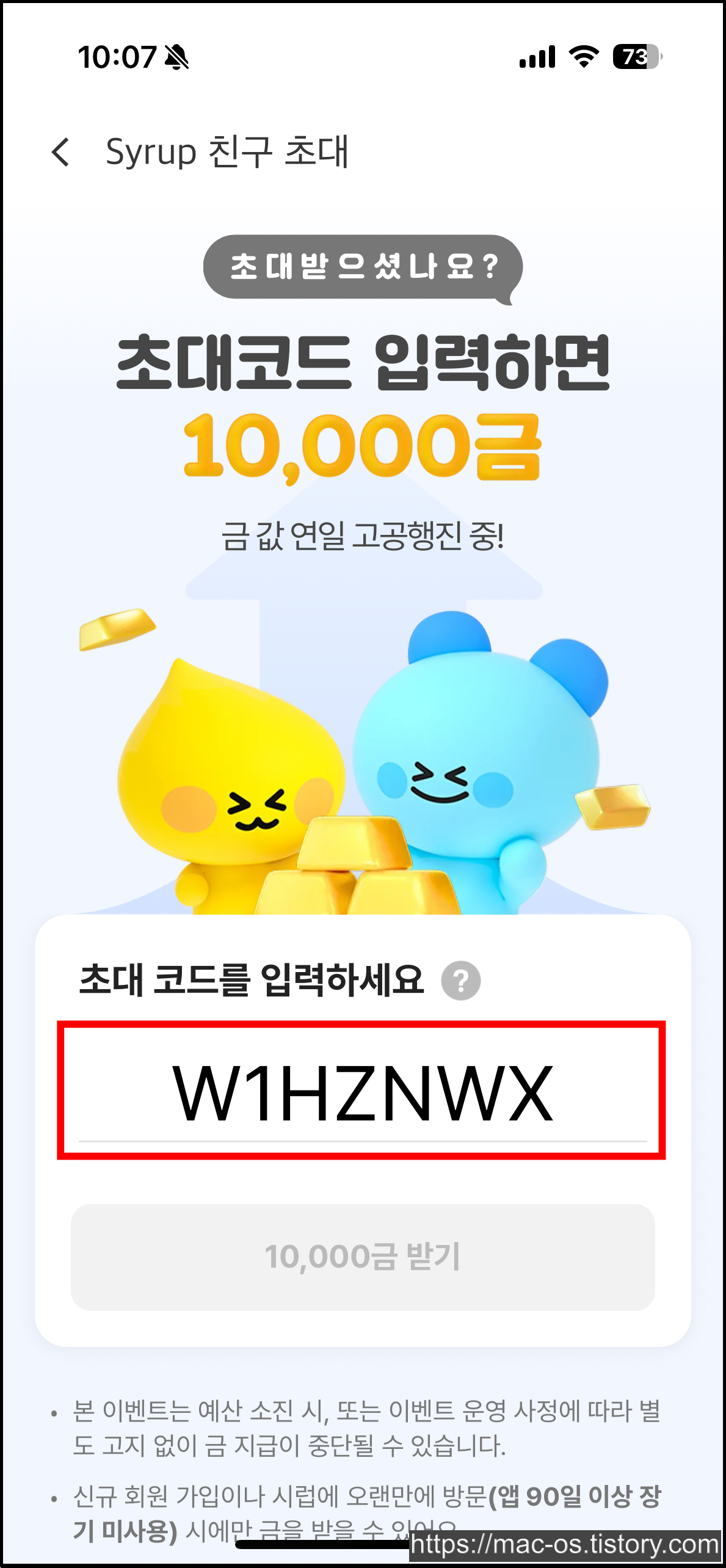 Syrup 친구초대 페이지에서 W1HZNWX를 복사해서 붙여넣기하면 1만금을 얻으실 수 있습니다. 금의 시세에 따라 1만금의 가치가 달라지지만 약 1300원~1500원 정도의 가치라고 보시면 되겠습니다. 초대코드를 입력하지 않으면 본인도 1만금을 받지 못하기 때문에 입력하는 것이 이득입니다.