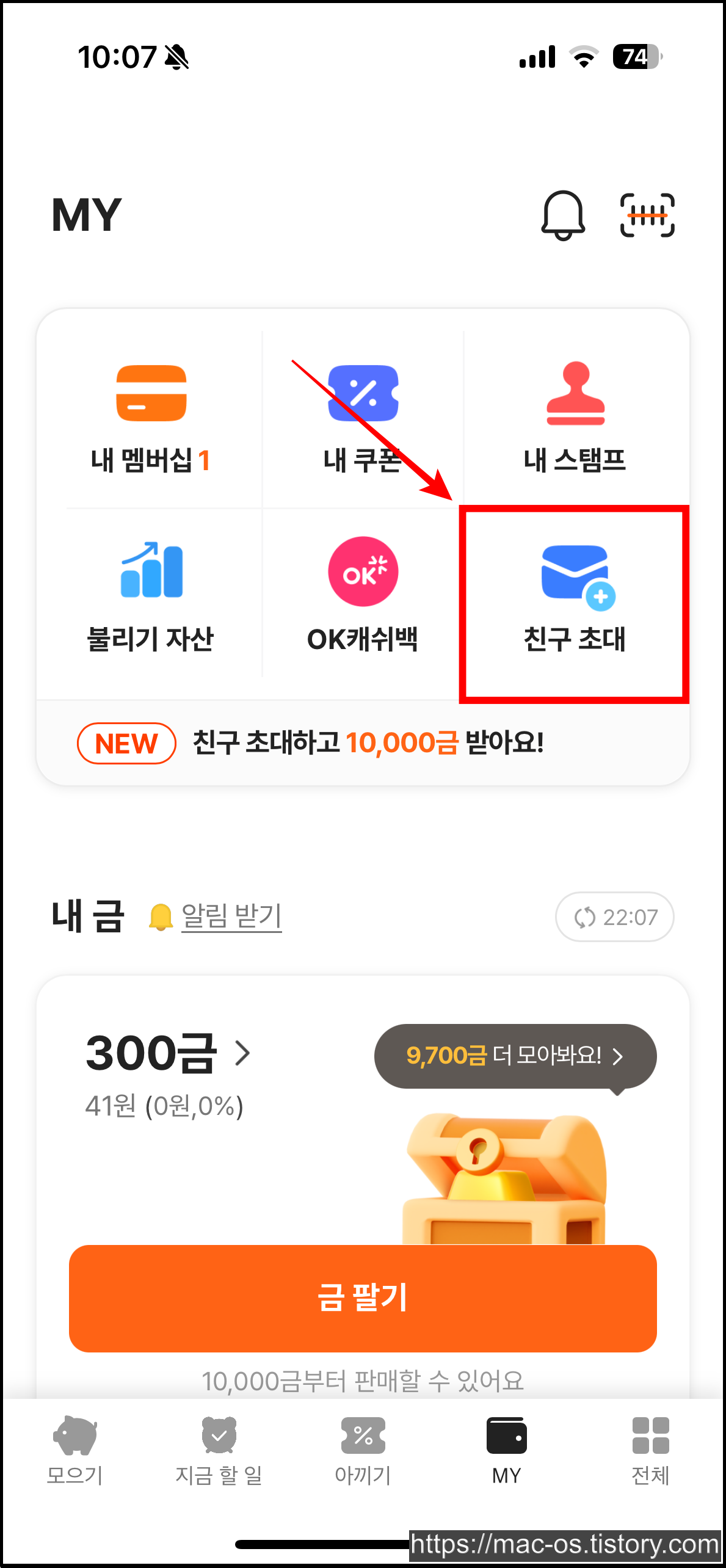 - 회원가입 후 [MY] → [친구 초대] → [초대코드 입력하기]로 이동하여 초대코드를 입력하면 1만 금을 받을 수 있다.