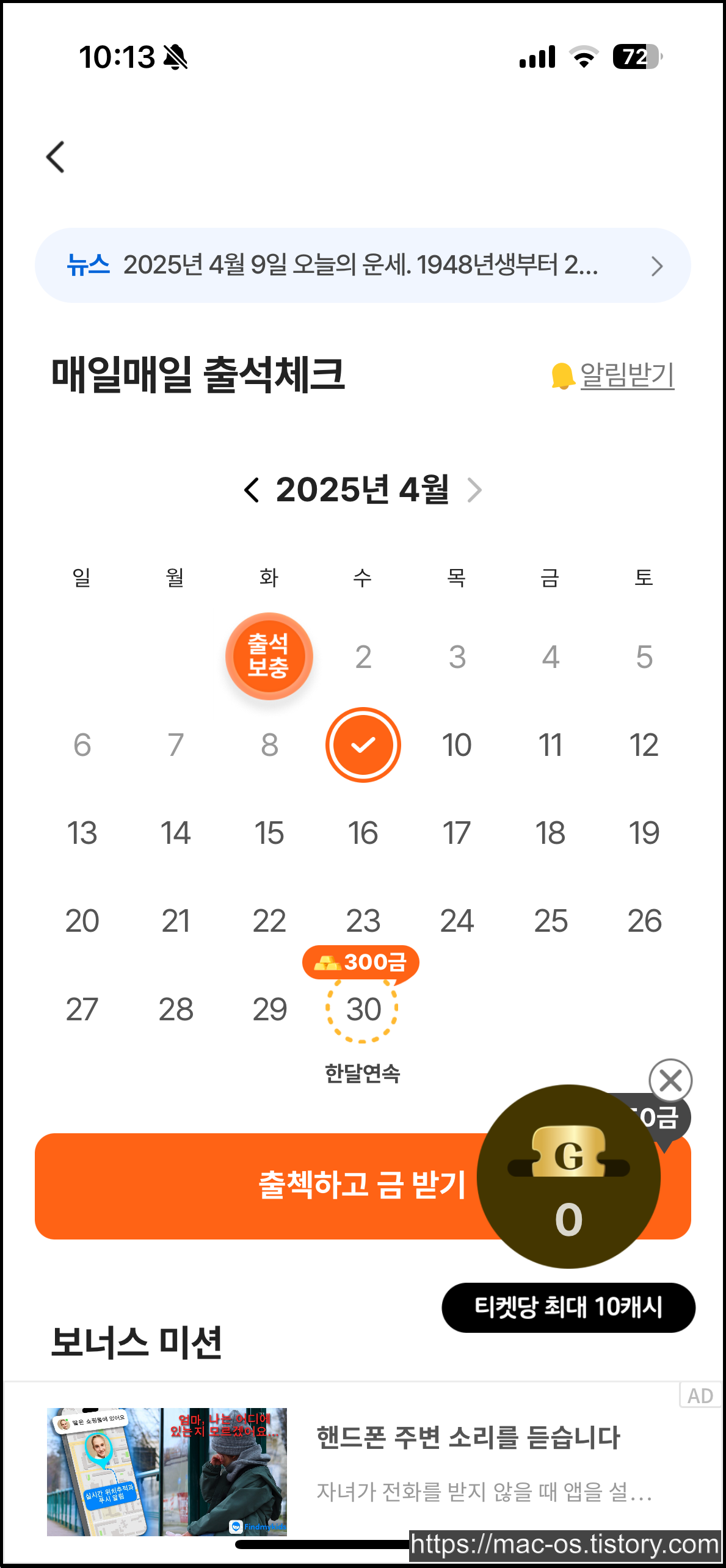 출석체크는 본인인증 기준으로 매일 1회 참여할 수 있습니다. 출석체크를 한달 모두 참여하고 캘린더의 '눌러서 300금 받기' 버튼을 클릭하면 300금을 리워드로 지급됩니다. 하루에 한번 출석하면 20~50금이 랜덤으로 적립받을 수 있습니다.