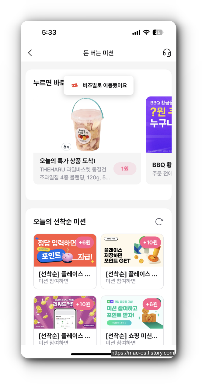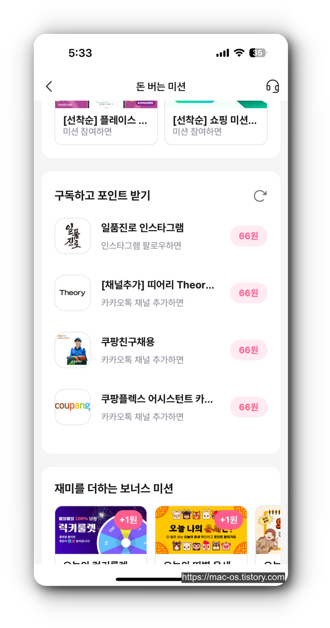 돈버는 미션이라는 것도 있는데, 버즈빌 광고 충전소가 연동되어있다. 인스타그램 팔로우, 카카오톡 채널 추가 등 광고를 하면 평균 1건당 66원 정도를 준다. 이것말고도 앱설치나 플레이스 저장 미션 등 다양하게 있다.