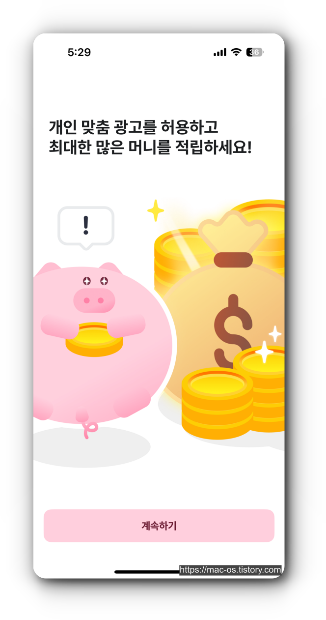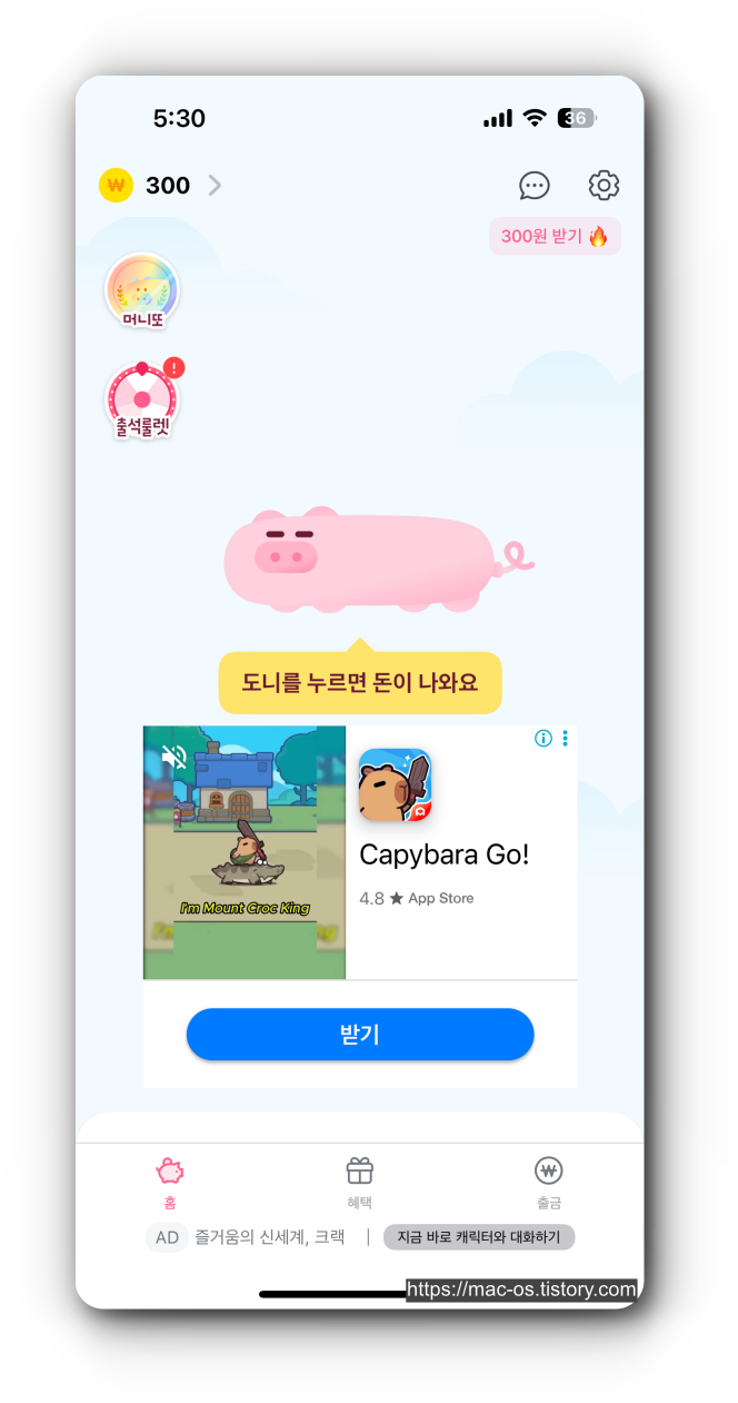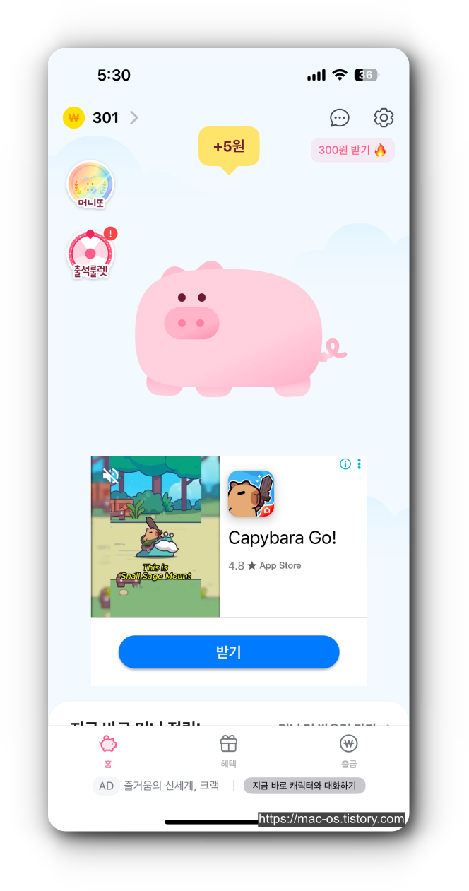 - 홈 화면 중앙에 있는 돼지를 연타해서 터치하면 9원 정도를 주는데 이후 10초 정도 배너 광고가 뜬다. 이렇게 포인트 적립이 가능함