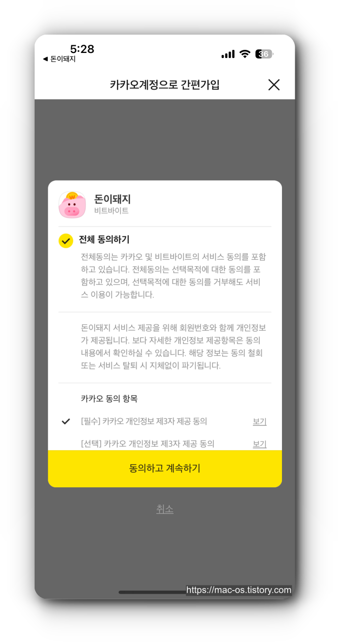 돈이돼지는 앱스토어와 플레이 스토어에서 설치할 수 있다. 카카오 로그인을 통해 회원가입이 진행된다.