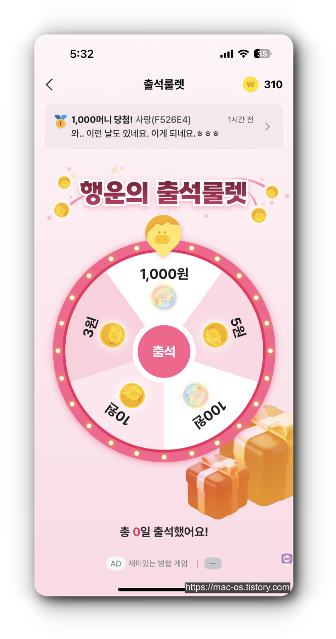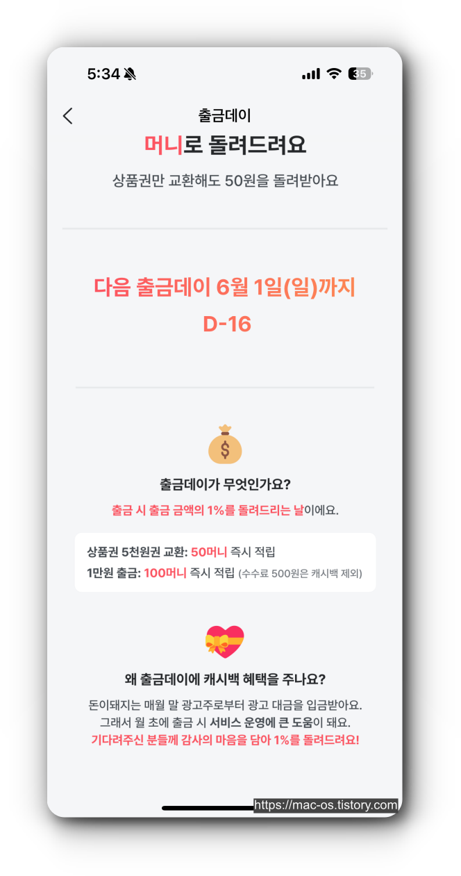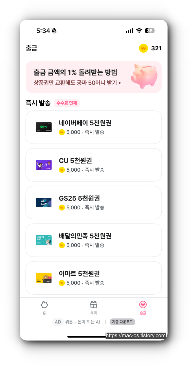 - 포인트는 1:1 비율로 기프티콘을 구매하거나 현금 출금하는 용도로 사용이 가능하다