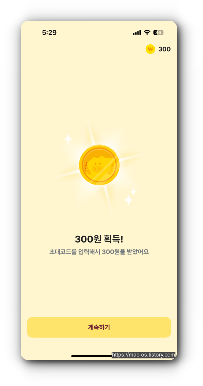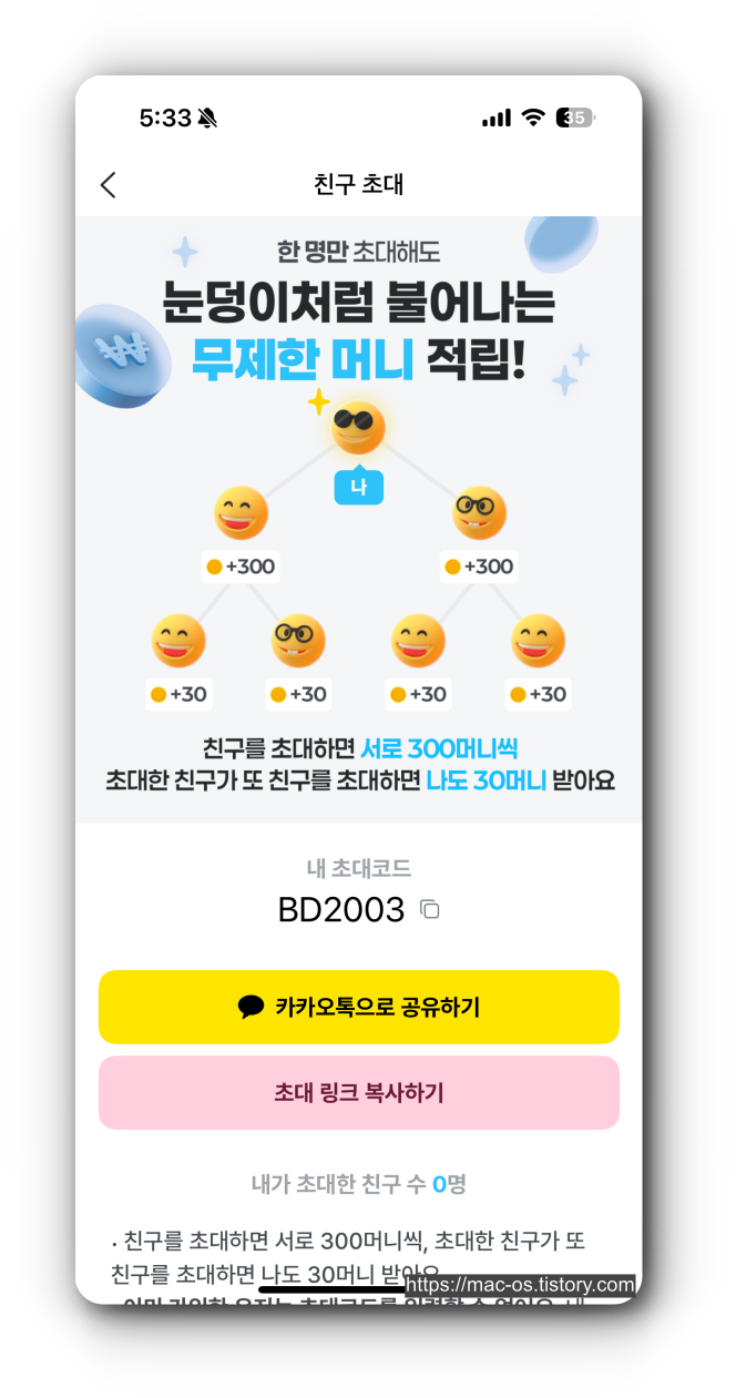 카카오 계정 로그인을 하면 초대코드 입력 페이지가 나오는데 여기서 BD2003을 입력하면 300포인트가 적립된다.