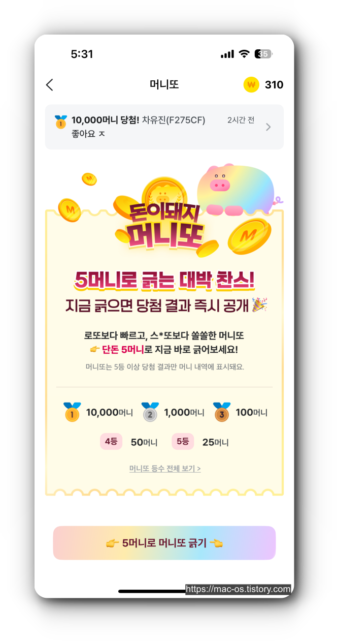 돈이돼지의 컨텐츠, 머니또와 출석룰렛이다. 우선 머니또는 5머니를 사용해 최대 1만머니부터 최소 25머니까지 일정 확률로 얻을 수 있고, 출석룰렛은 최소 3원부터 천원까지 노릴 수 있는 룰렛이다.