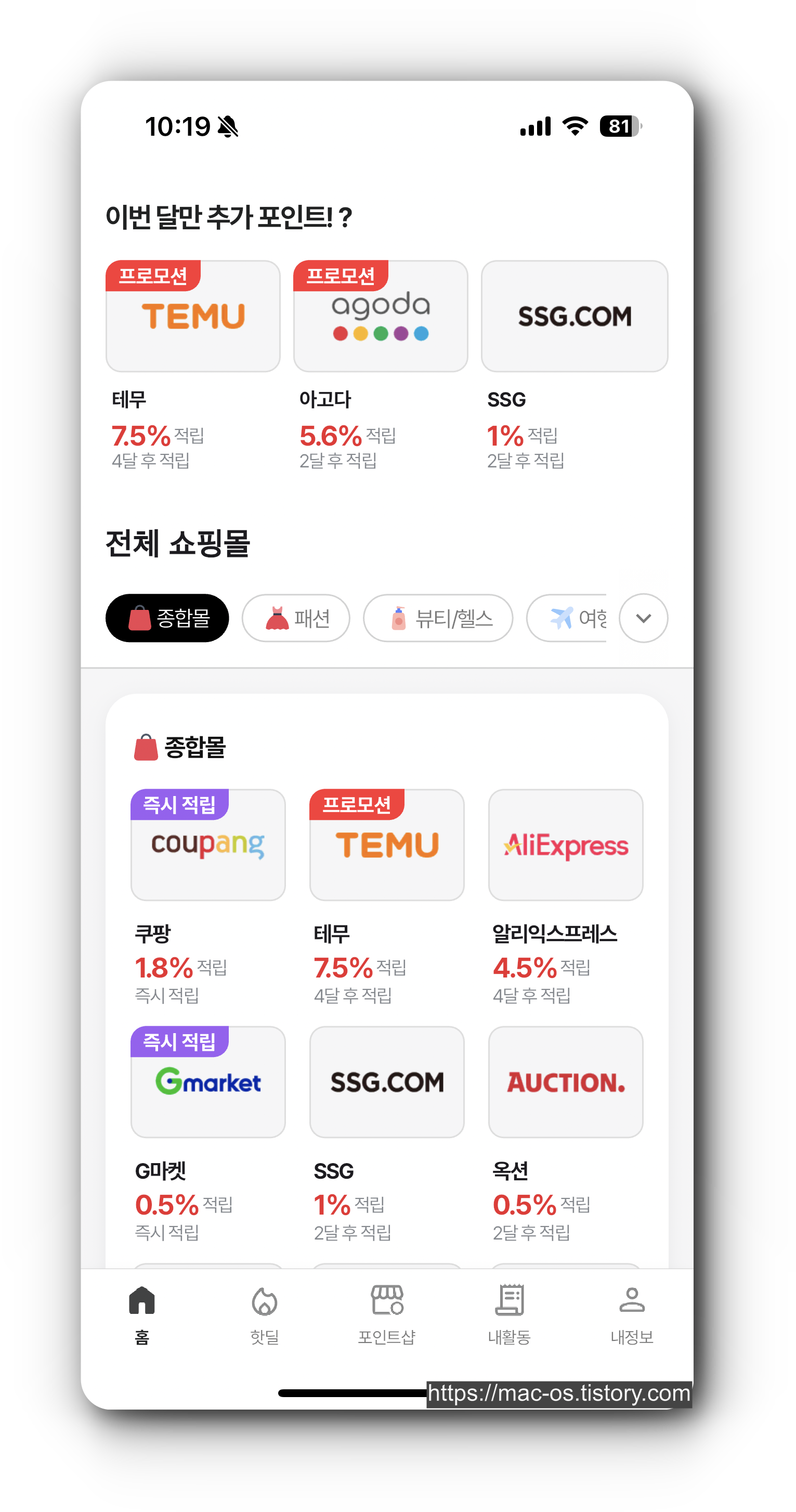 참새마트의 포인트 적립방법에 대해 간단하게 살펴보겠습니다. 홈 화면에서 아래로 스크롤을 내리면 여러가지 쇼핑몰이 있는데, 여기서 마음에 드는 쇼핑몰을 선택하고 스토어로 이동해서 평소대로 상품을 결제하면 참새마트 포인트가 적립됩니다.