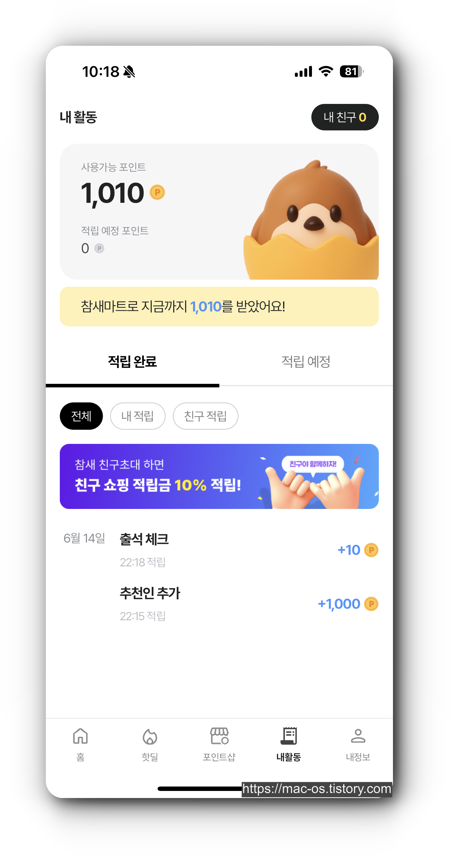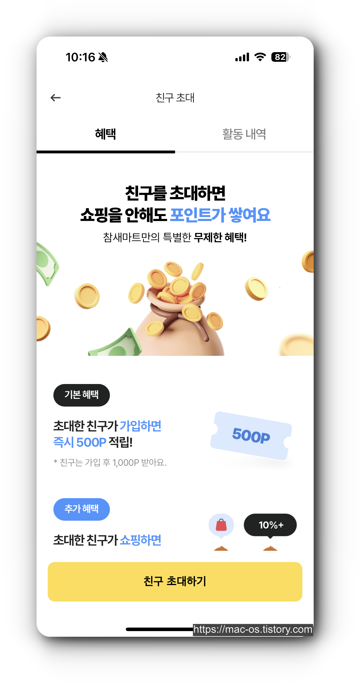 - 초대한 친구가 가입하면 즉시 500P 적립