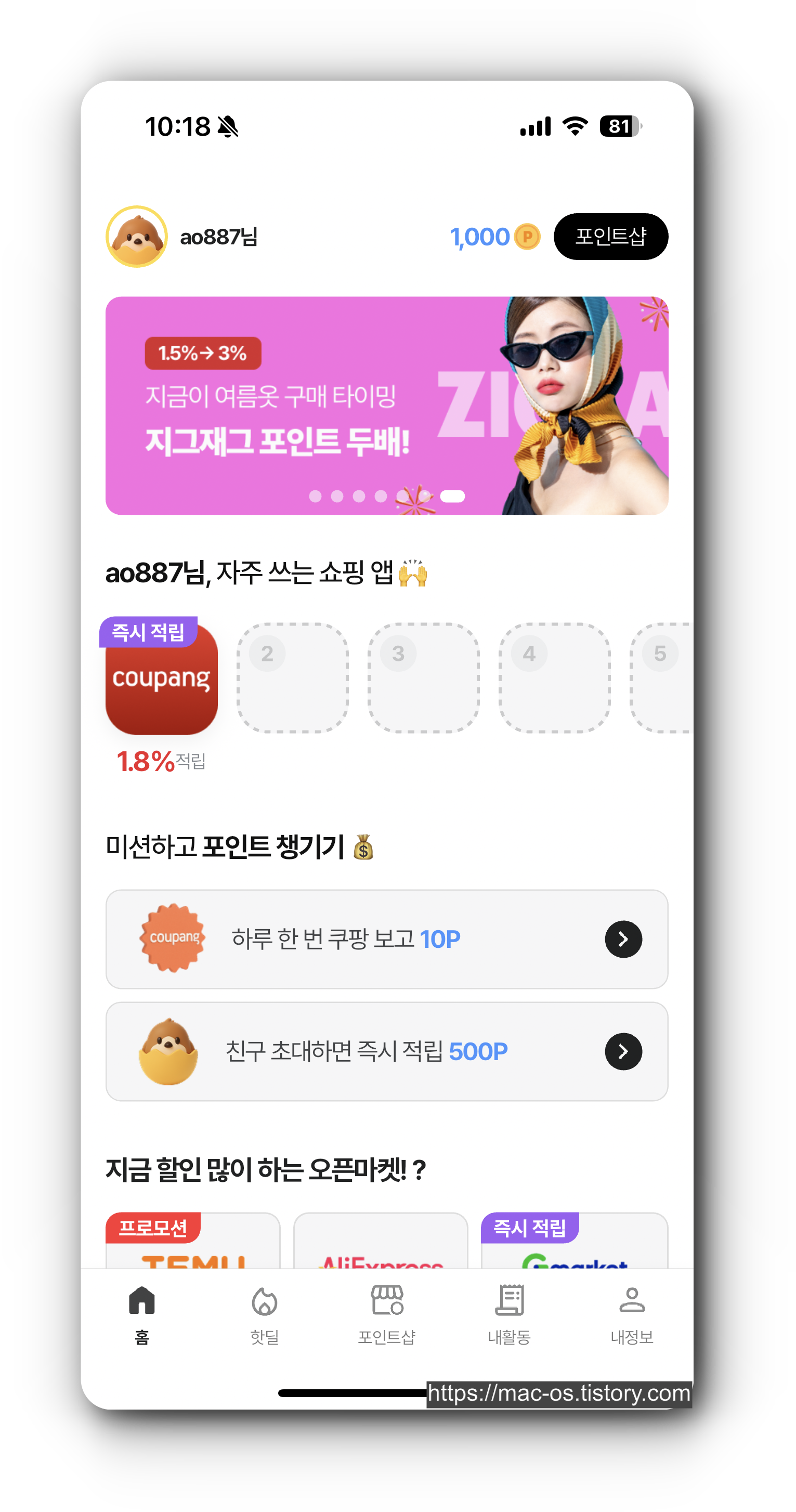 참새마트의 홈 화면 하단에서 '하루 한 번 쿠팡 보고 10P' 버튼을 누르면 쿠팡 광고 사이트로 이동되며 다시 앱으로 돌아오면 출석체크 보상으로 10포인트가 적립된 것을 볼 수 있습니다.
