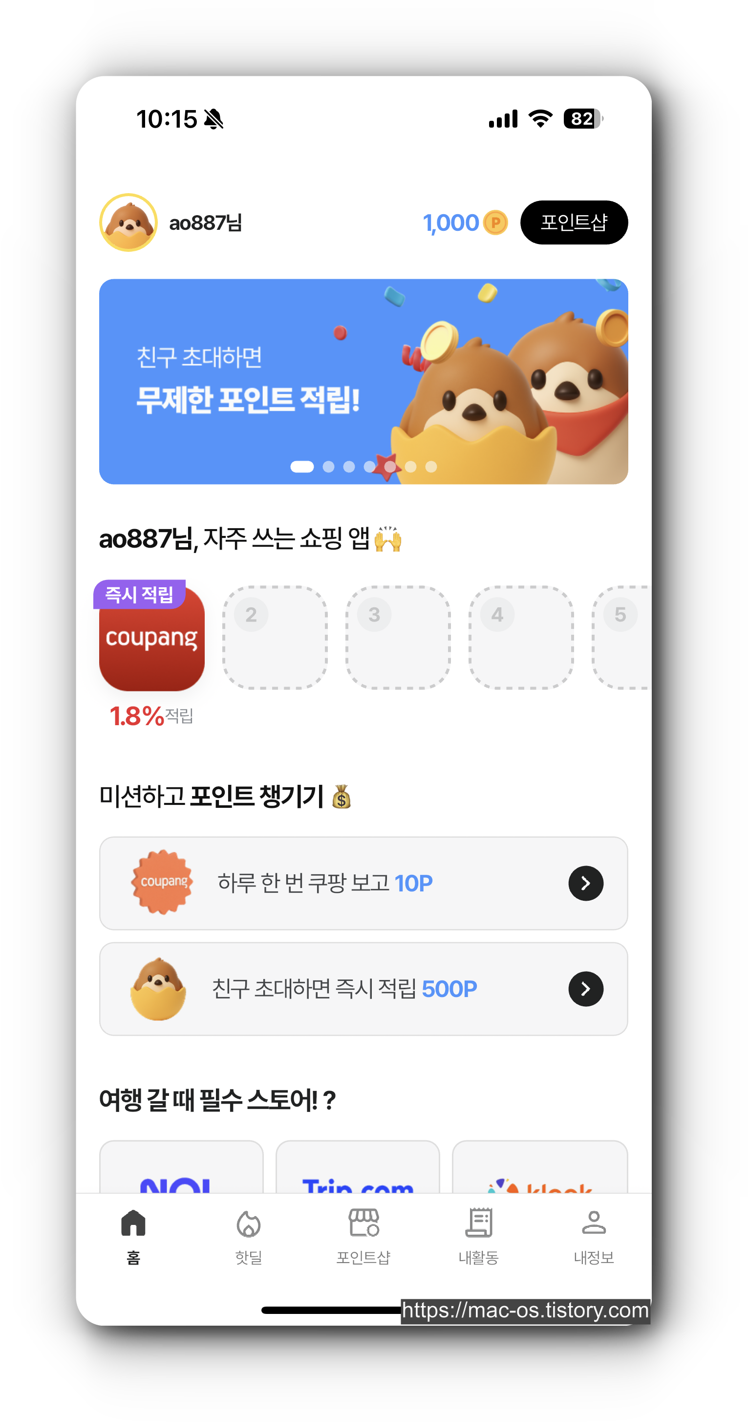 - 매일마다 출석체크(하루 한번 쿠팡보기)를 하면 10포인트가 적립된다.