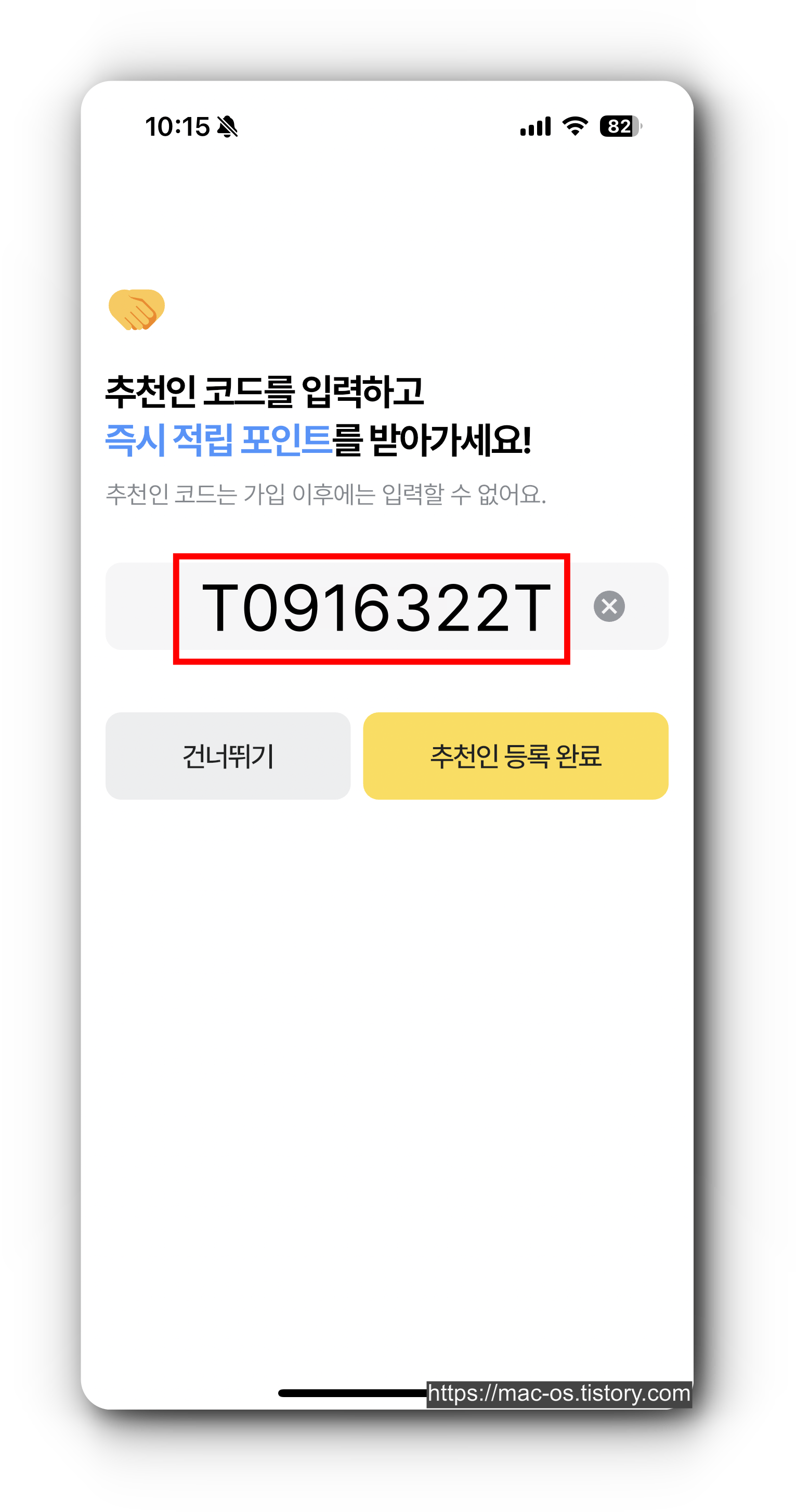 약관에 동의하면 추천인 코드를 입력하는 페이지가 나오는데 여기서 T0916322T를 복사해서 붙여넣기하면 1000포인트를 받고 시작할 수 있습니다.