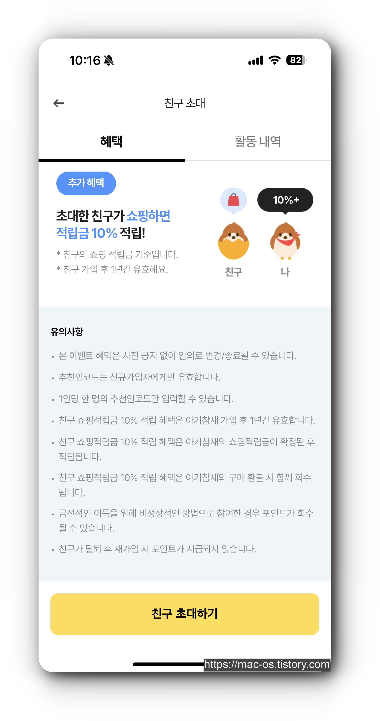 - 초대한 친구가 쇼핑하면 적립금 10% 적립(친구의 쇼핑 적립금 기준이며, 친구 가입 후 1년간 유효)