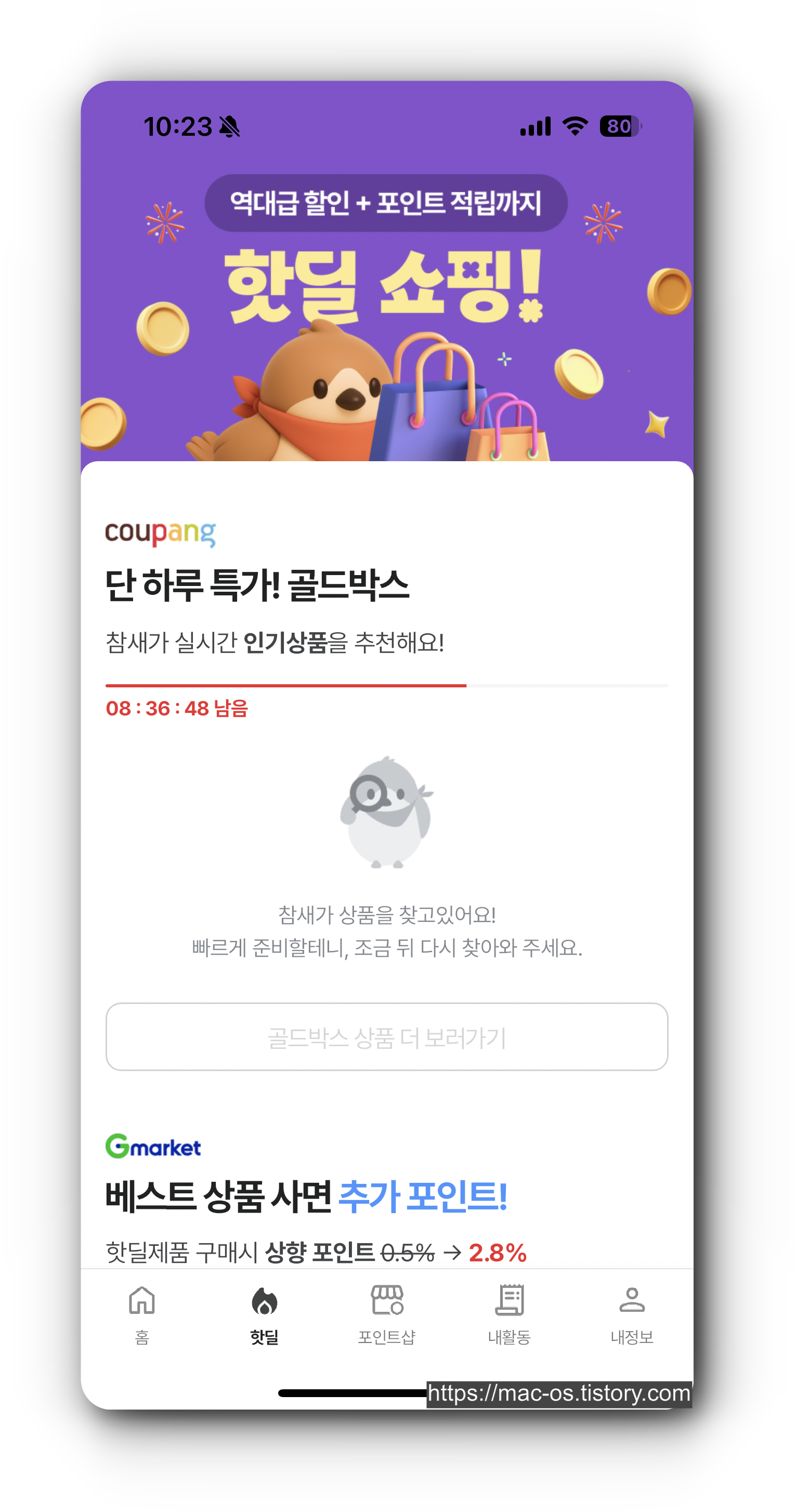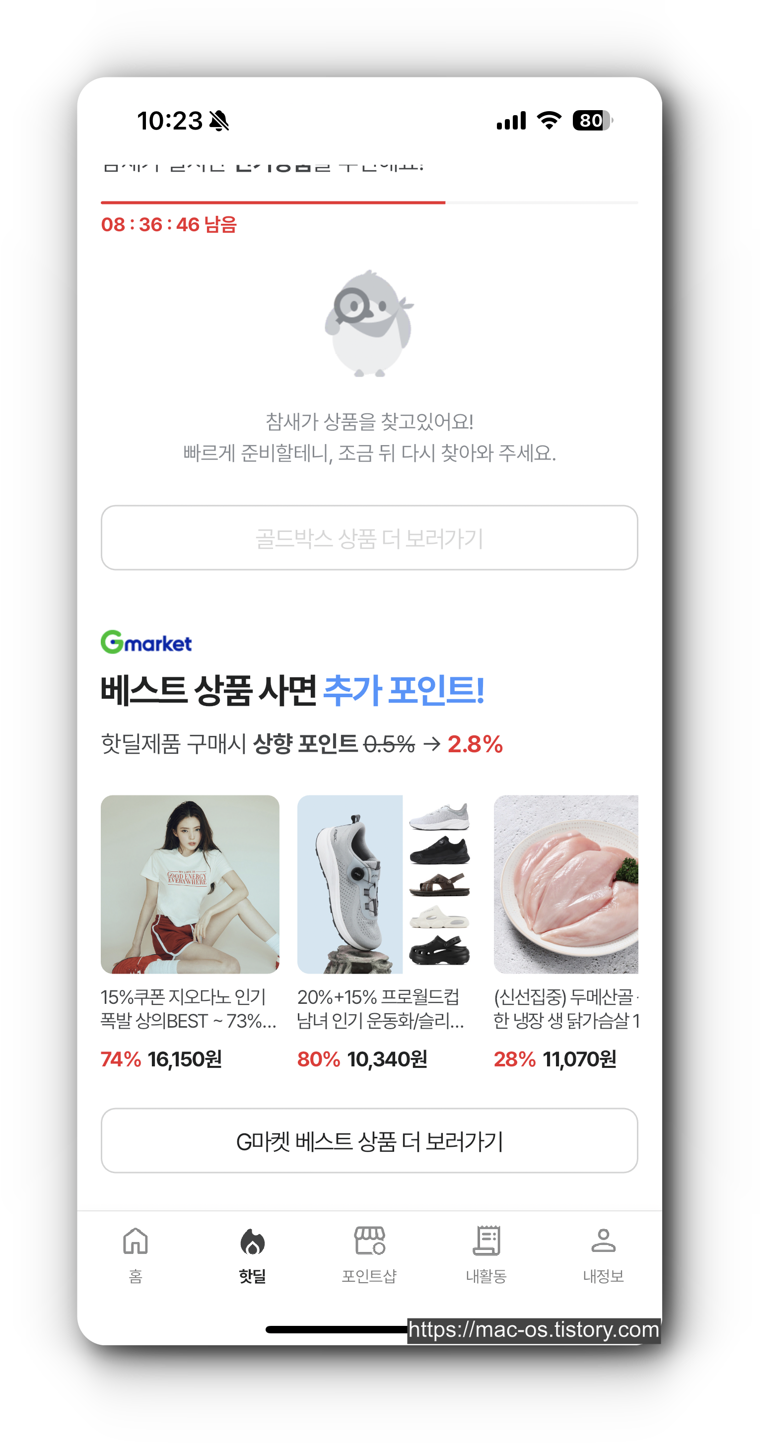 핫딜 페이지에서는 참새가 쿠팡 실시간 인기상품을 추천해주는 위젯과 G마켓 베스트 상품 사면 추가 포인트를 주는 위젯이 있습니다.