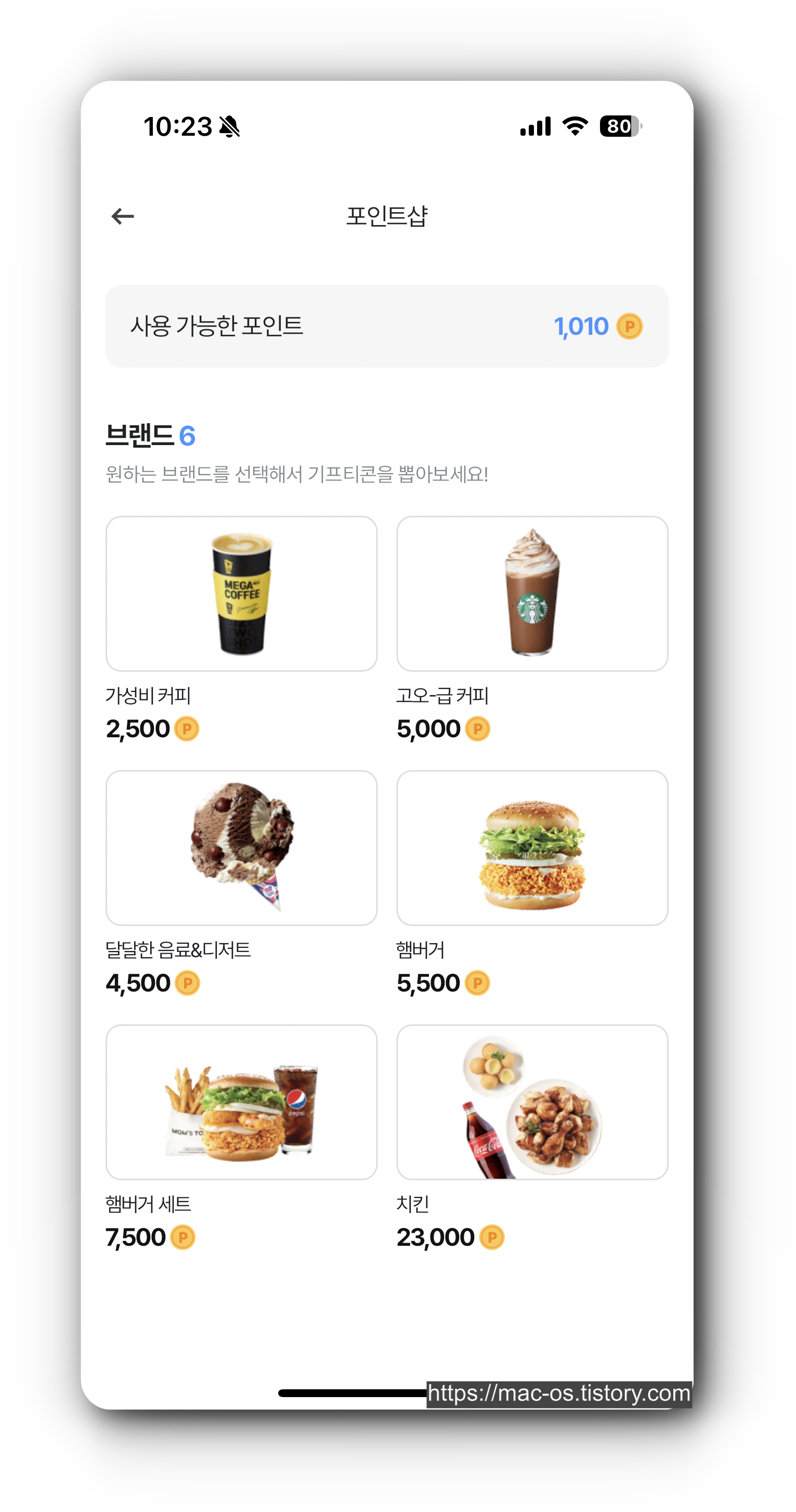참새마트에서 적립한 포인트는 포인트샵에서 커피, 디저트, 햄버거, 치킨 등 다양한 기프티콘을 구매하는 데 사용할 수 있습니다. 단, 원하는 브랜드의 상품을 직접 고를 수는 없고, 하루에 한 번 포인트를 사용해 목록에 있는 커피 중 하나를 무작위로 추첨받는 방식입니다.