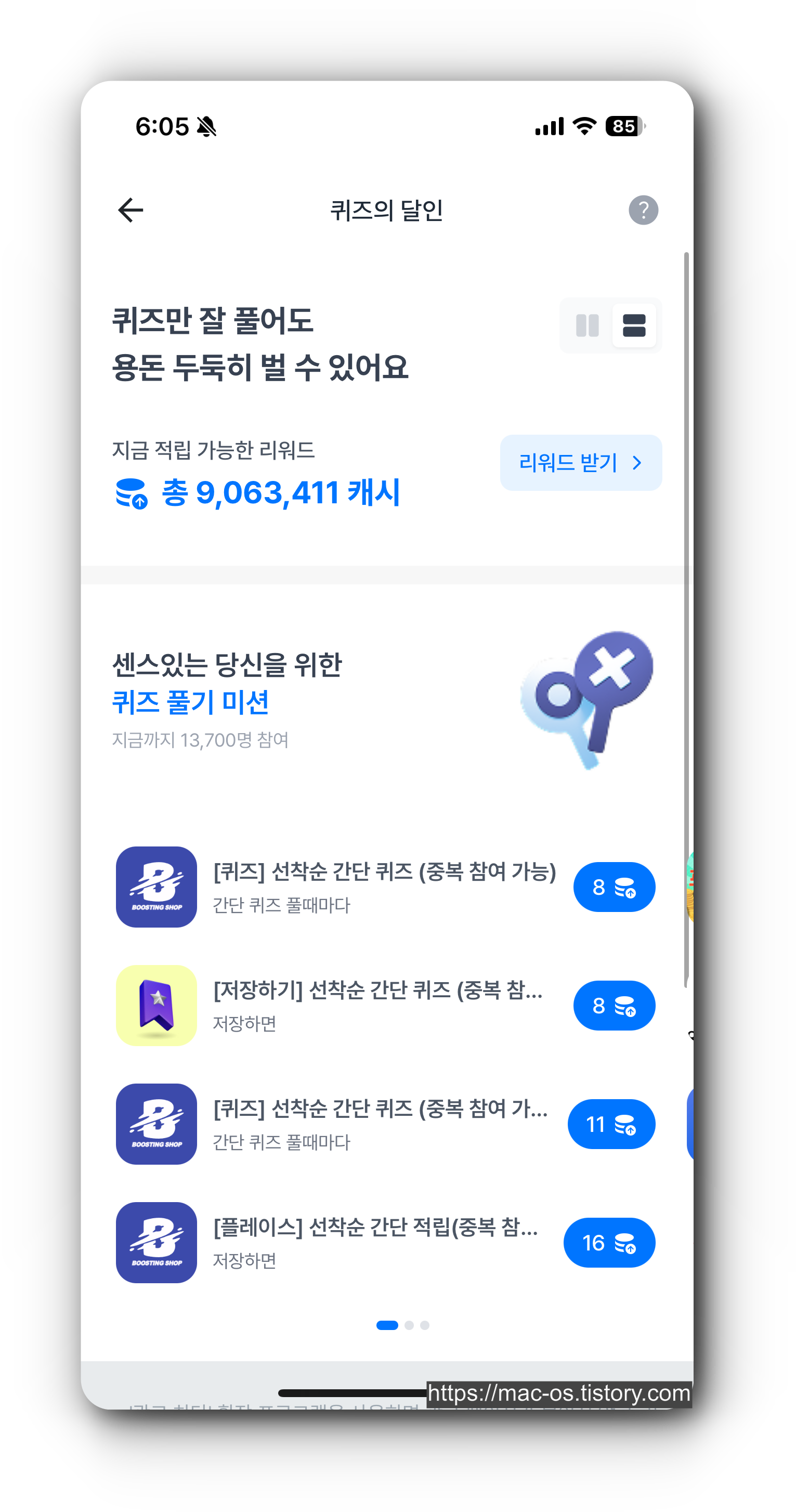 퀴즈 풀기 미션에서는 선착순 간단퀴즈, 네이버 플레이스 저장하기 등의 미션에 참여하고 평균 8~15 캐시를 받을 수 있습니다.