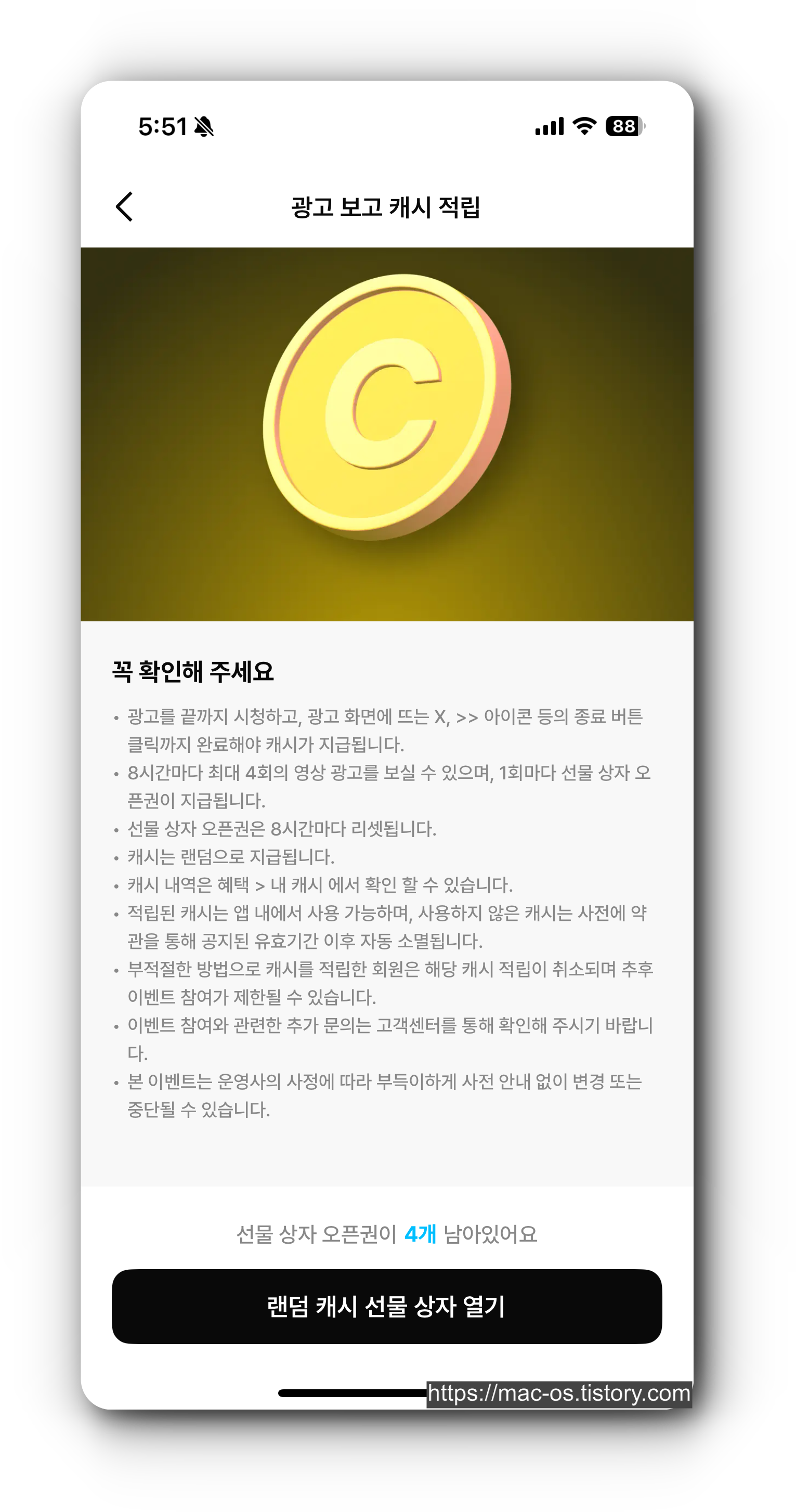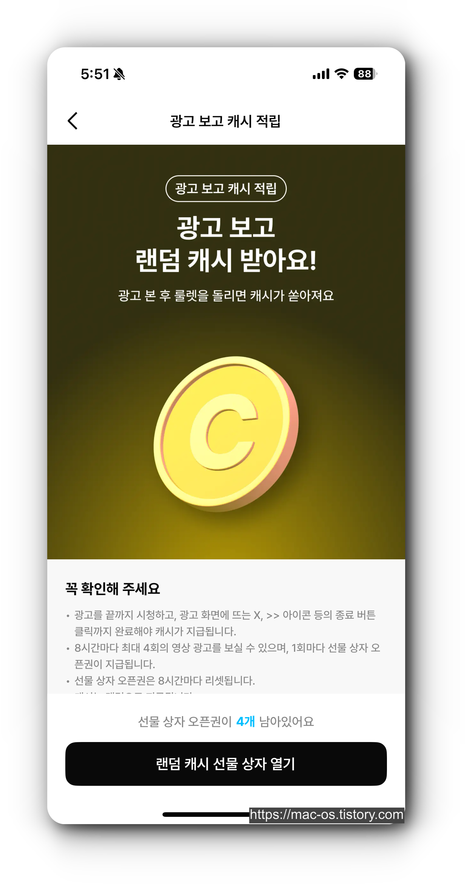 8시간마다 최대 4회의 영상 광고를 볼 수 있으며, 1회마다 선물 상자 오픈권이 지급됩니다. 선물 상자 오픈권은 8시간마다 리셋되며 캐시는 랜덤으로 지급됩니다. 제가 한번 해봤는데 30~60초 되는 광고 영상이 나오고 그걸 끝까지 시청했더니 5캐시를 받았습니다.