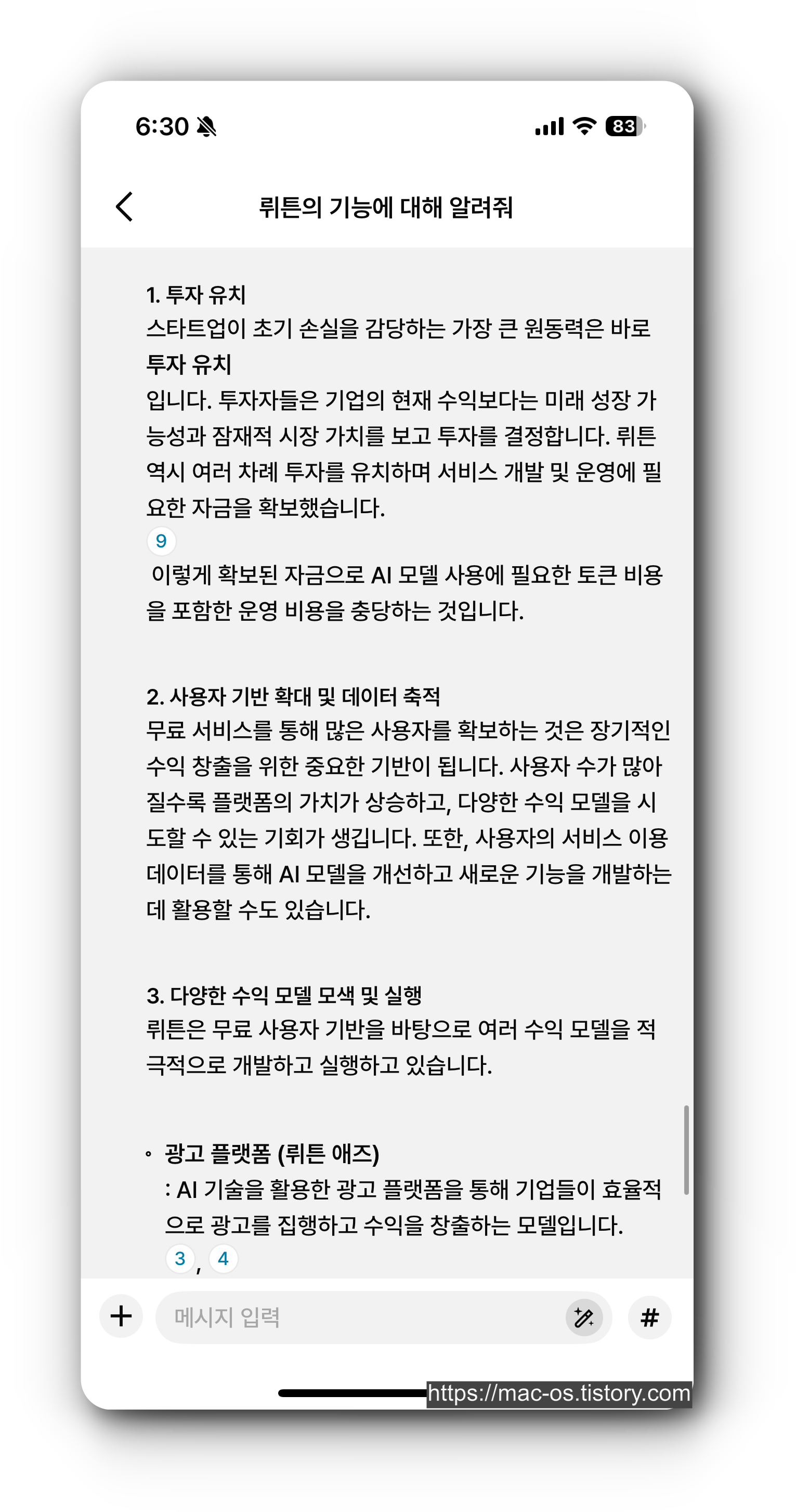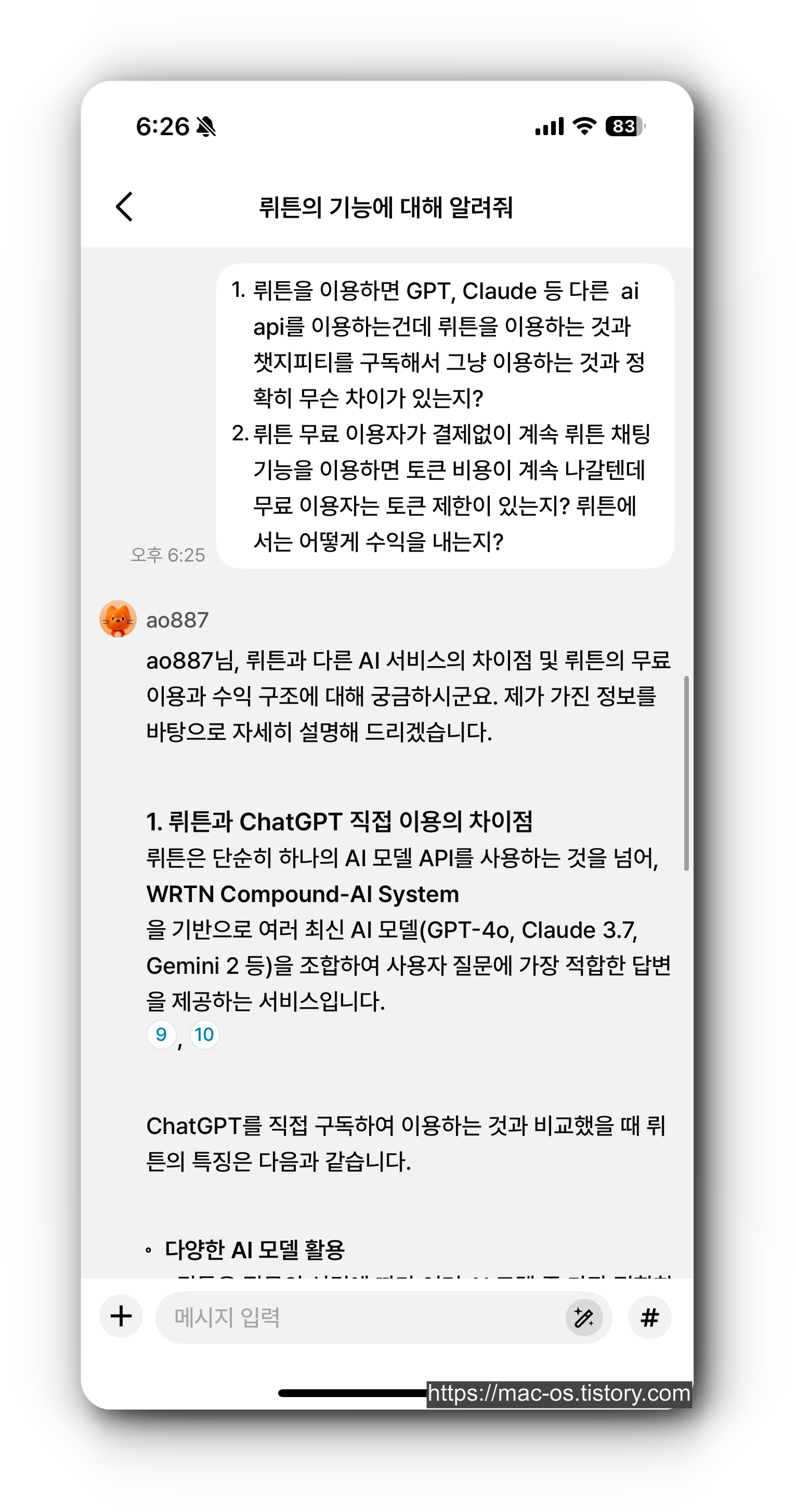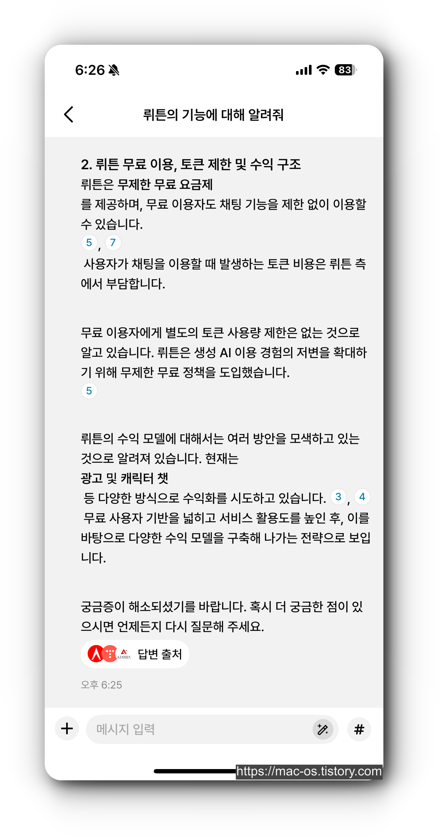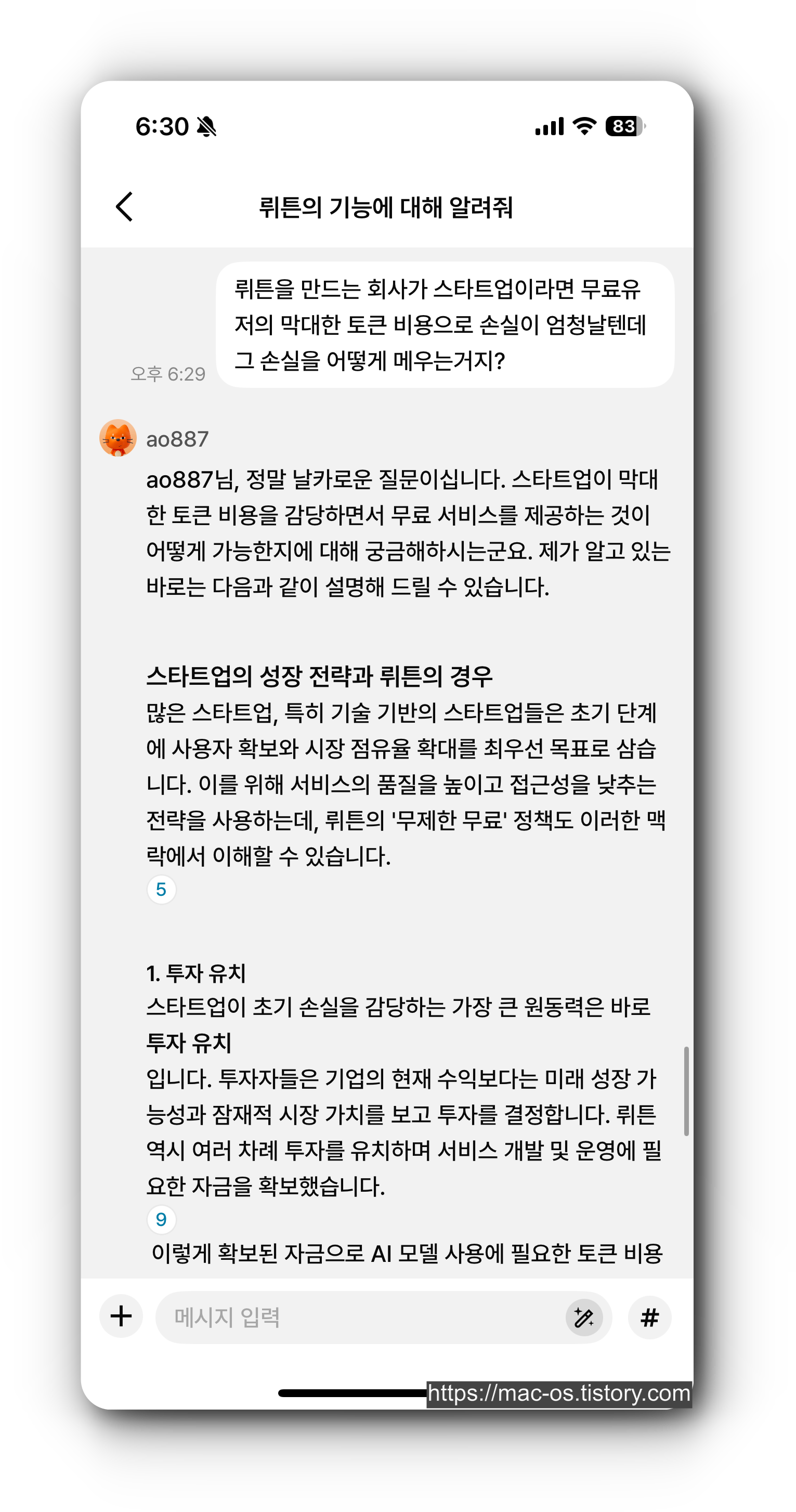 결론만 말하자면 뤼튼은 무제한 무료 요금제로, 챗지피티의 무료 사용자 토큰 제한(무료 사용자는 GPT-4o mini 모델만 사용할 수 있으며 오래 사용하면 일정 시간동안 채팅이 제한되는데 이게 바로 토큰 제한임) 같은 것이 없다고 하네요.