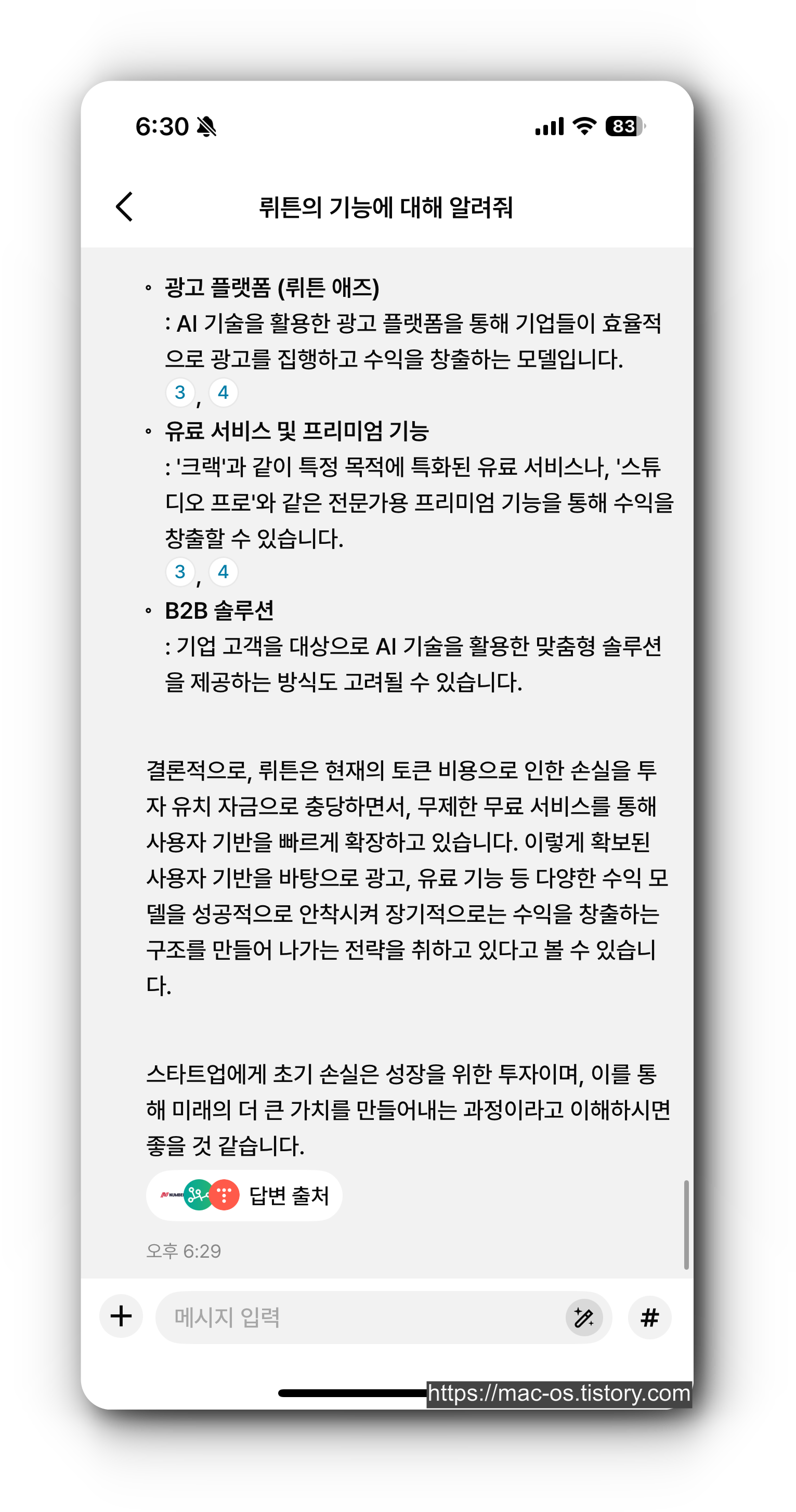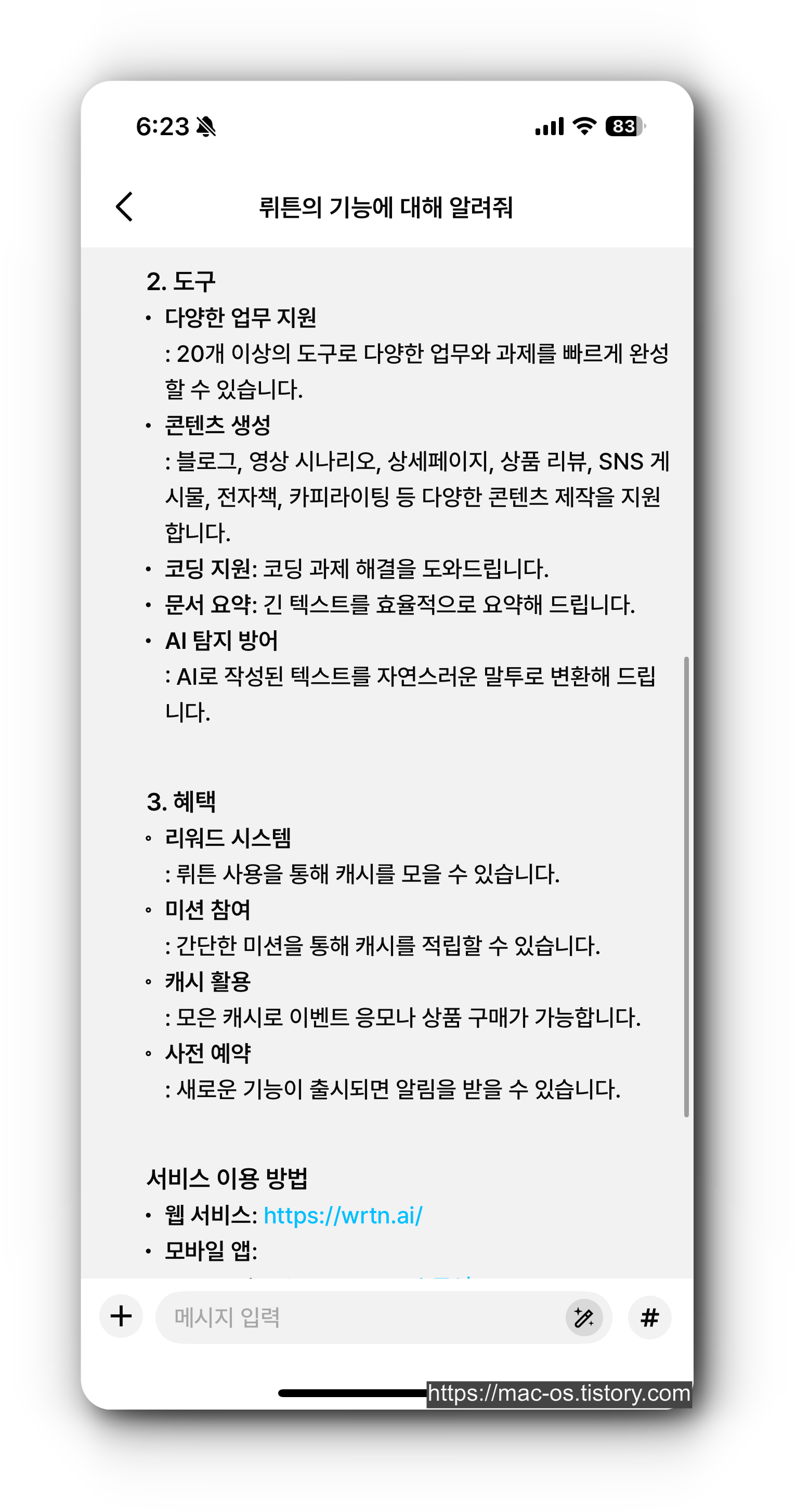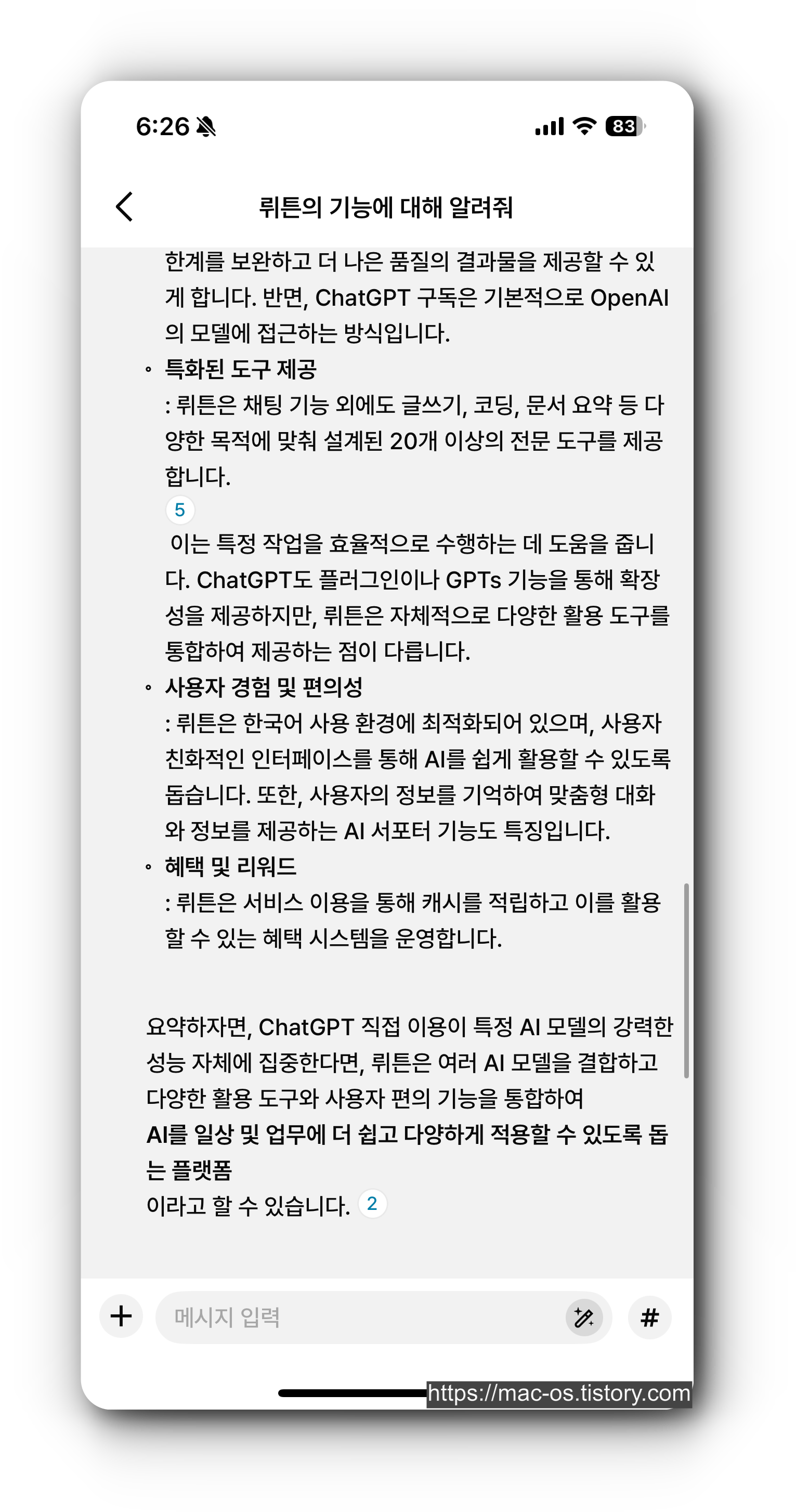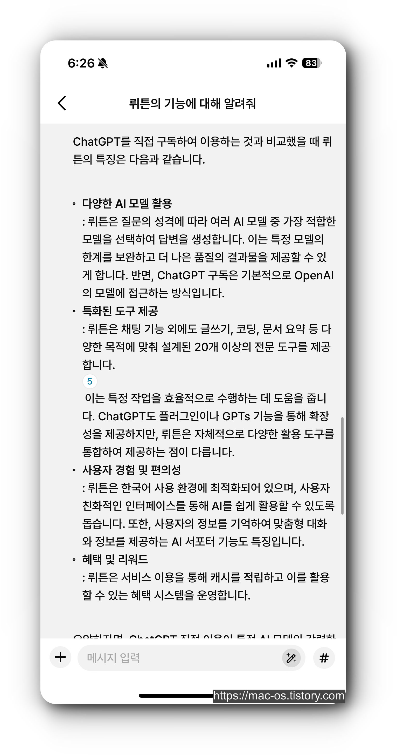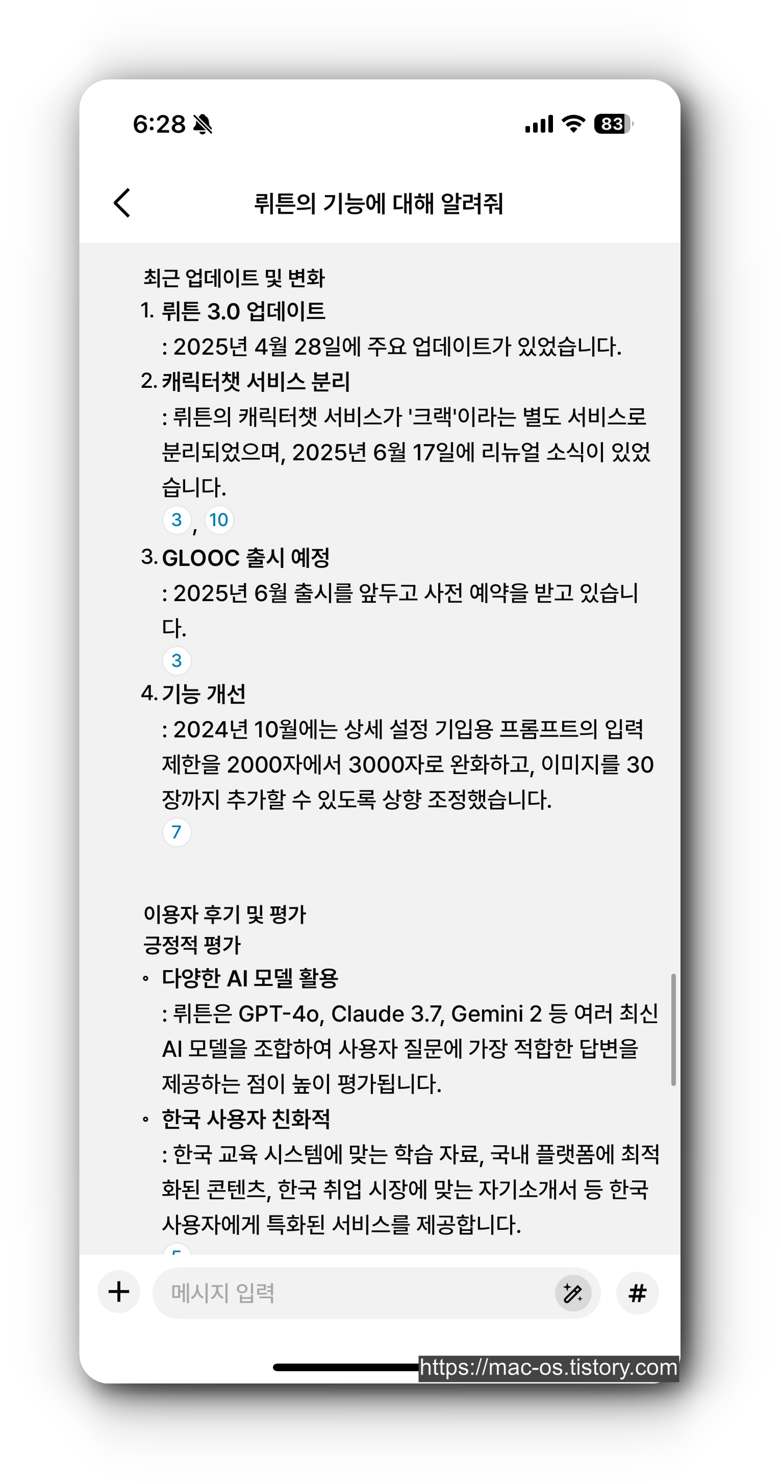 결론만 말하자면 뤼튼은 무제한 무료 요금제로, 챗지피티의 무료 사용자 토큰 제한(무료 사용자는 GPT-4o mini 모델만 사용할 수 있으며 오래 사용하면 일정 시간동안 채팅이 제한되는데 이게 바로 토큰 제한임) 같은 것이 없다고 하네요.