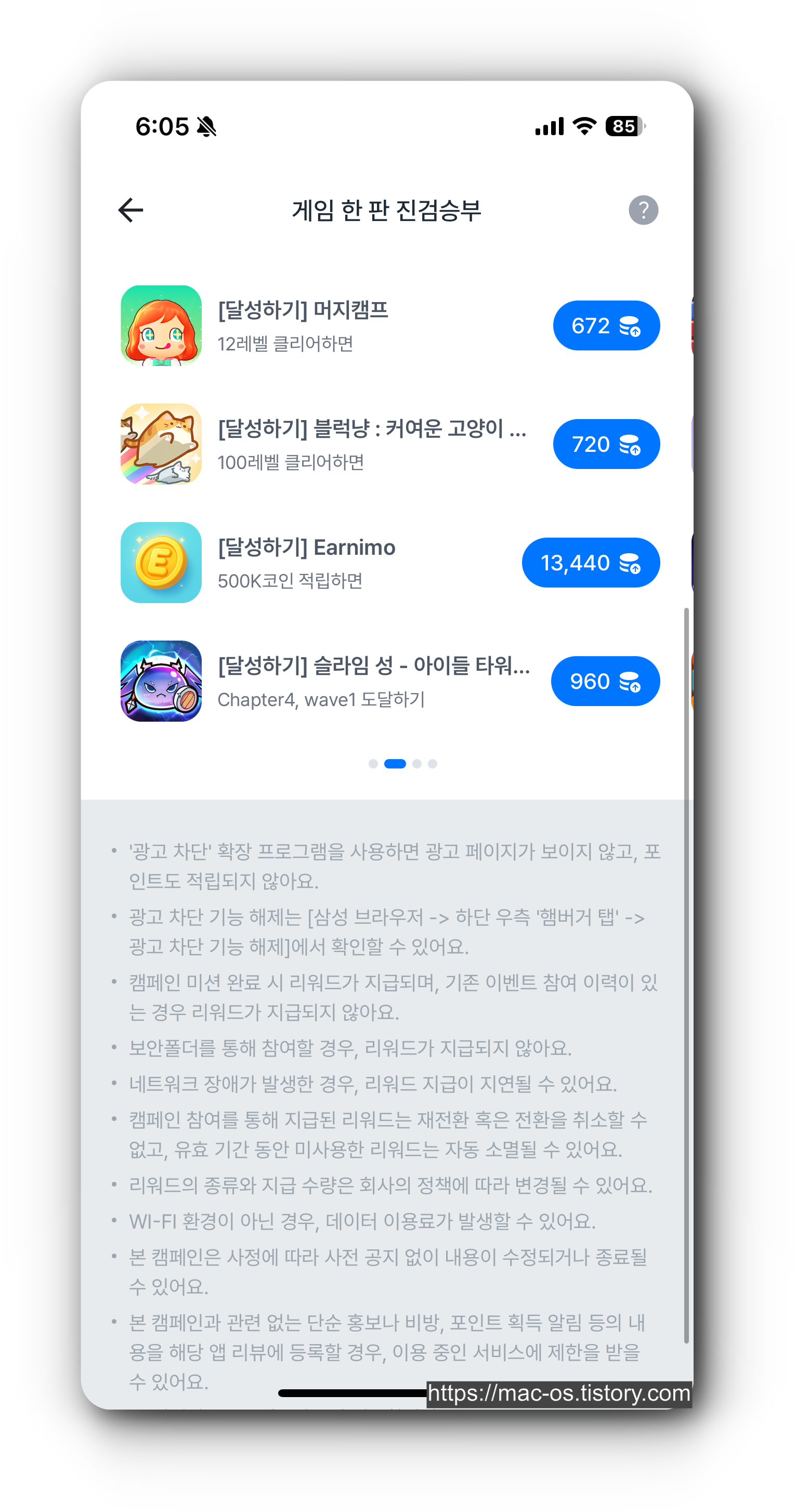게임 최초 실행, 레벨12 도달하기, 특정 미션 달성하기 등의 미션을 완료하면 앱 실행은 130포인트, 레벨 미션은 1500포인트 정도를 보상으로 줍니다. 해외 게임이 자주 보이는걸로 보아 아마 해외 광고 충전소 느낌인 듯 하네요.