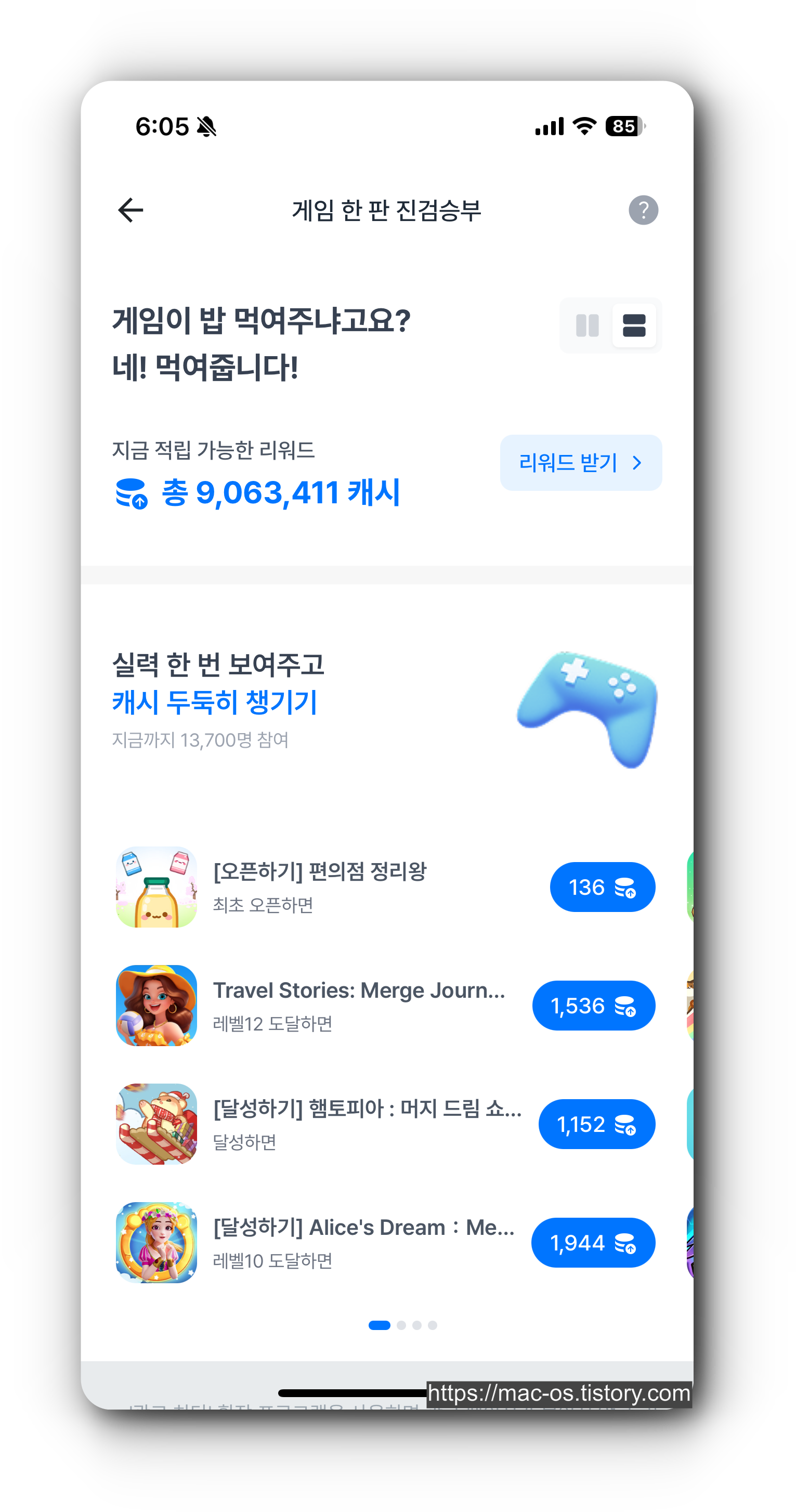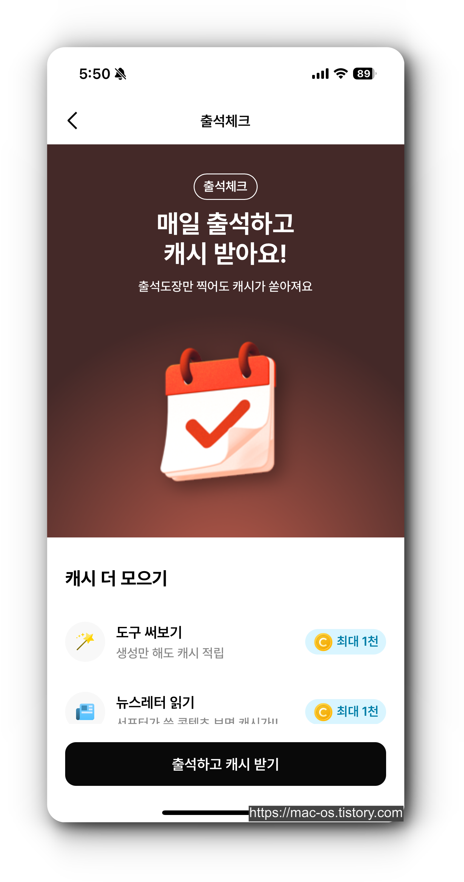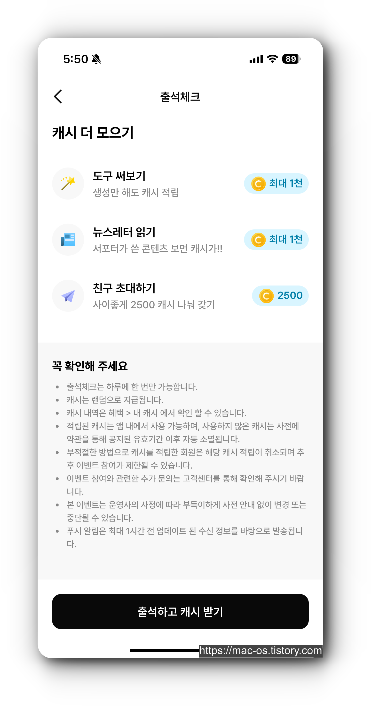 매일마다 출석체크를 하고 보상으로 포인트를 받을 수 있습니다. 출석하고 캐시 받기 버튼을 누르면 캐시를 받을 수 있습니다. 한번 눌러봤는데 저는 3캐시를 받았네요. 3캐시가 고정되어 있는건지 랜덤으로 더 많이 받을 수도 있는건지는 아직 잘 모르겠습니다.