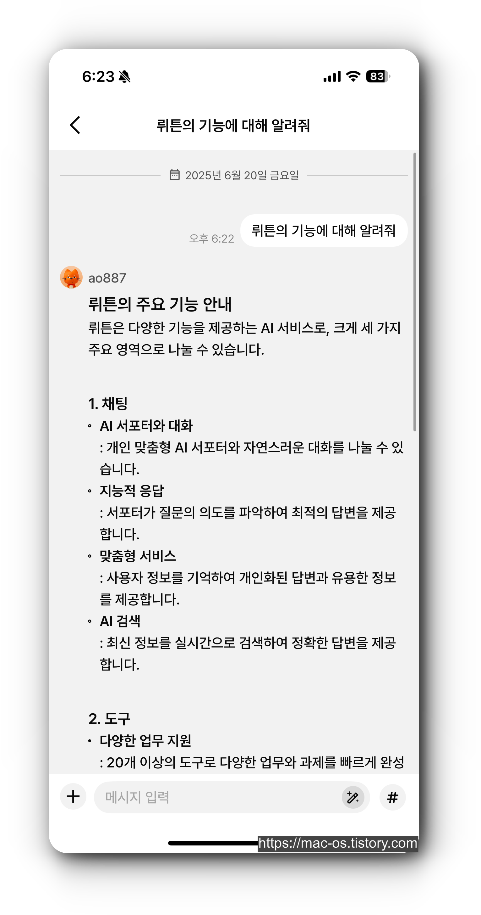 그래서 뤼튼이라는 앱이 정확히 무슨 앱이고, 앱테크 말고도 무슨 기능을 제공하는지 알고 싶어 뤼튼의 생성형 AI에게 주요 기능에 대해 물어봤습니다.