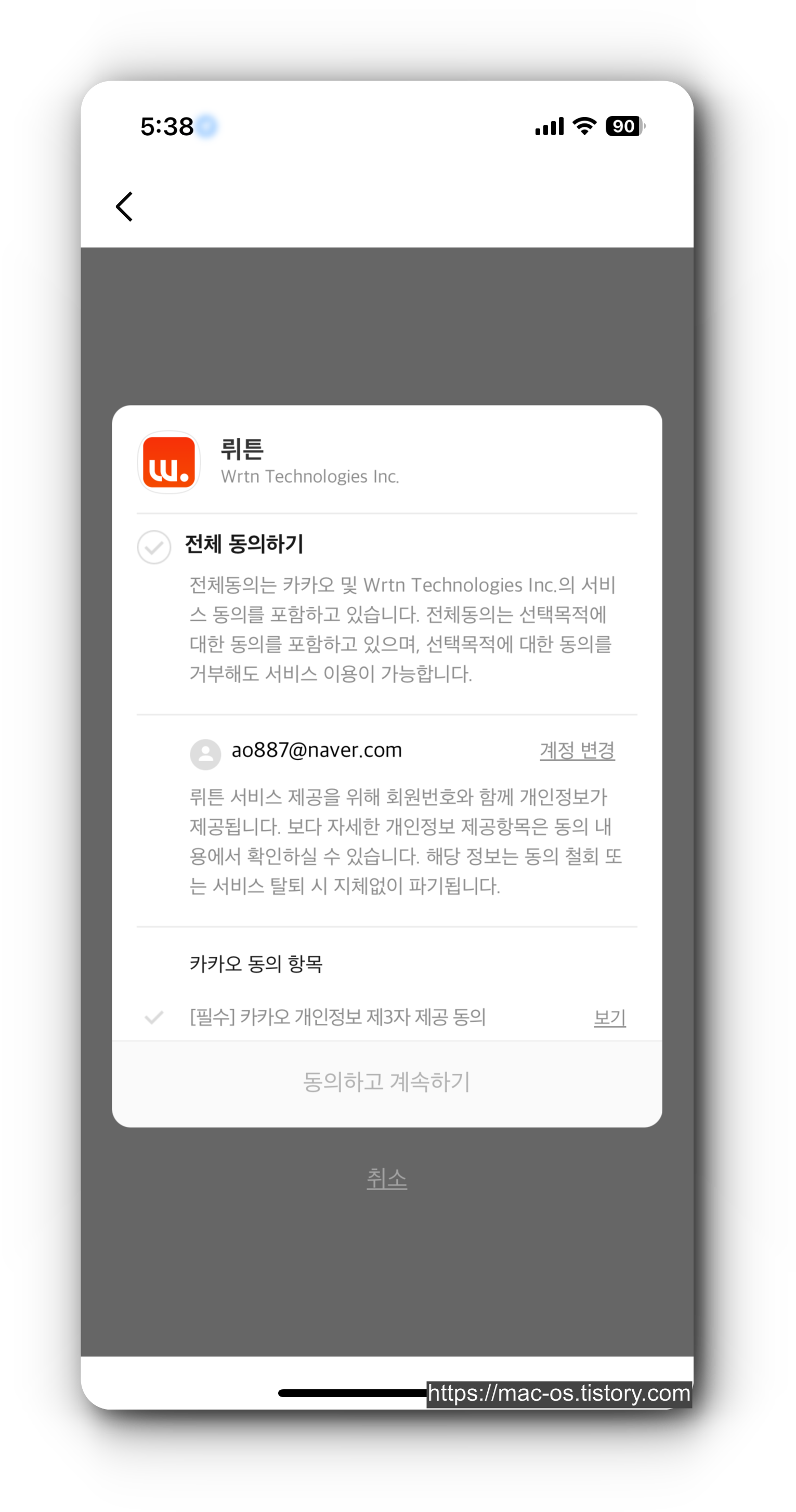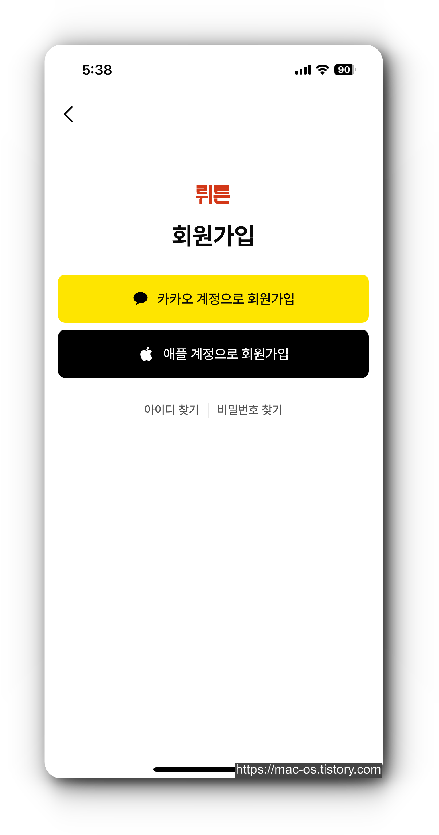 회원가입을 누르니까 카카오 계정으로 회원가입, 애플 계정으로 회원가입 2개가 있어서 카카오로 진행했습니다.