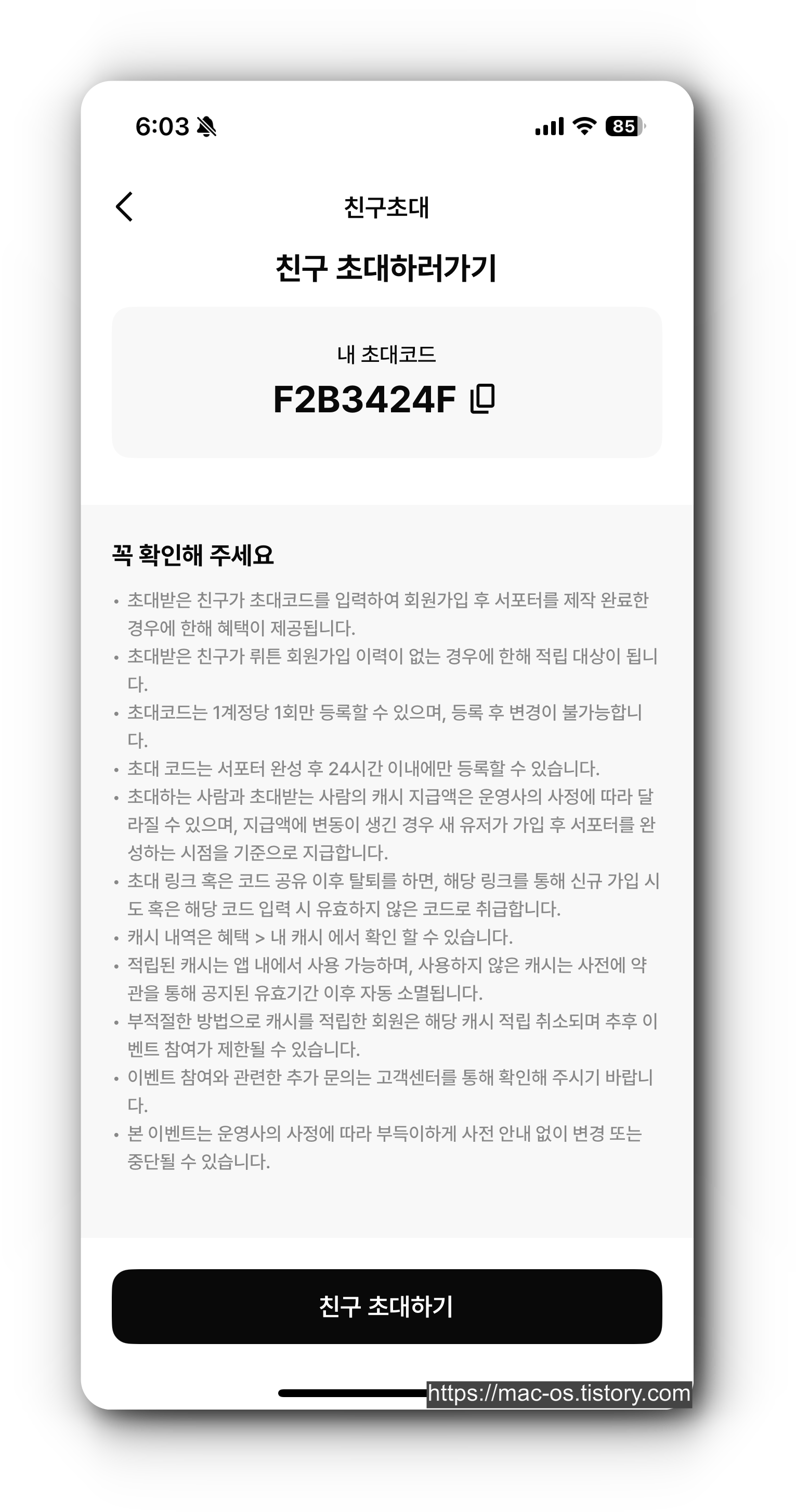 초대받은 친구가 초대코드를 입력하여 회원가입 후 서포터를 제작 완료한 경우에 한해 신규회원에게는 500캐시, 초대한 사람에게는 2000캐시가 지급됩니다. 초대코드는 서포터 완성 후 24시간 이내에만 입력할 수 있습니다.