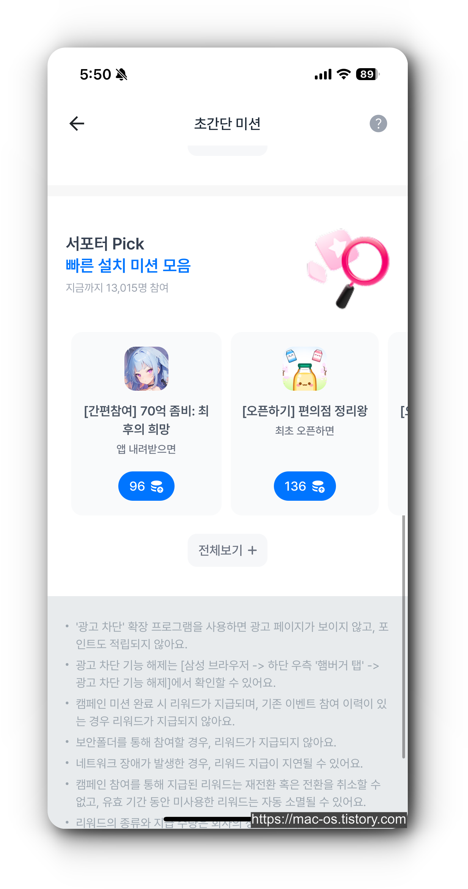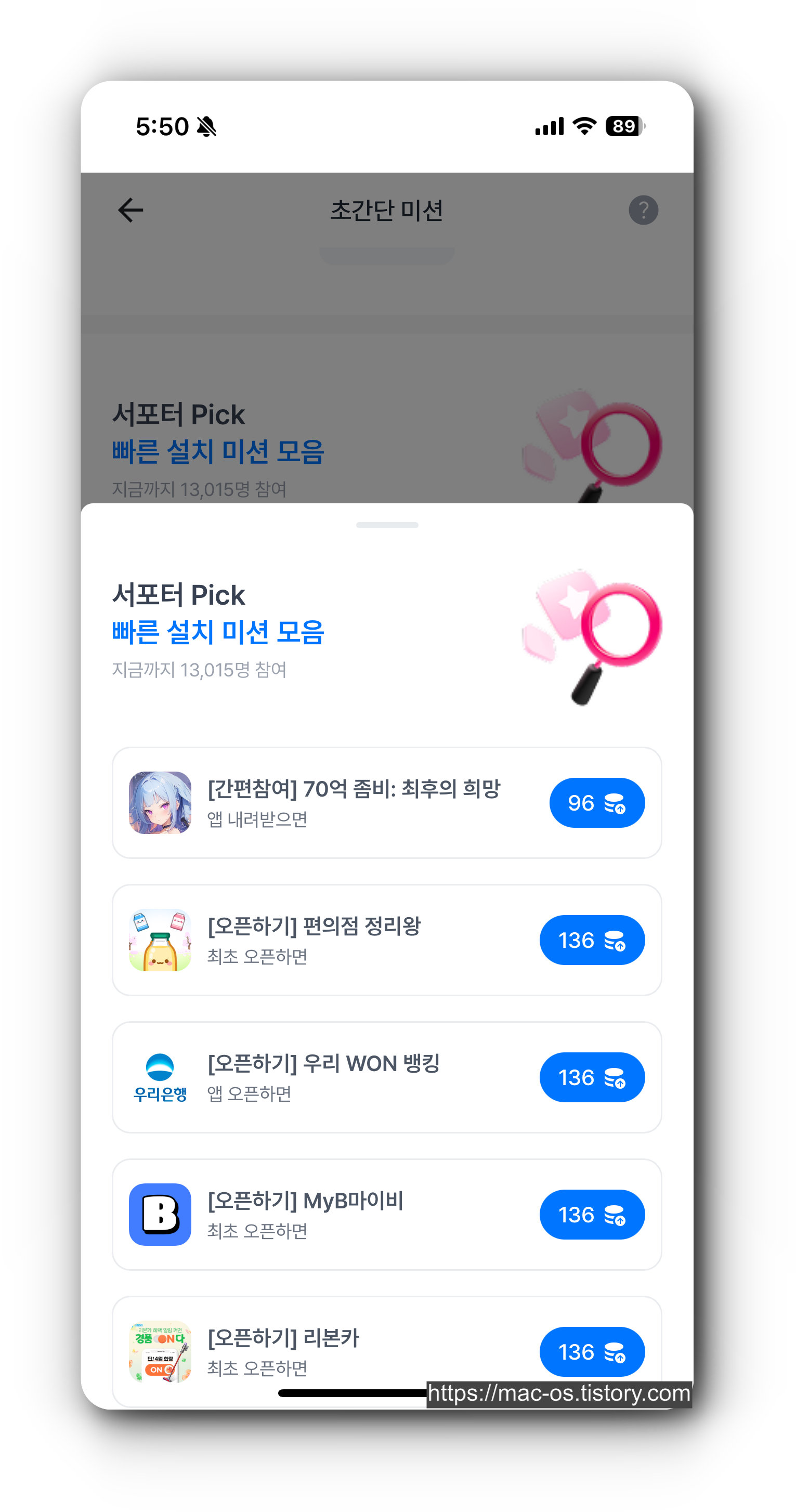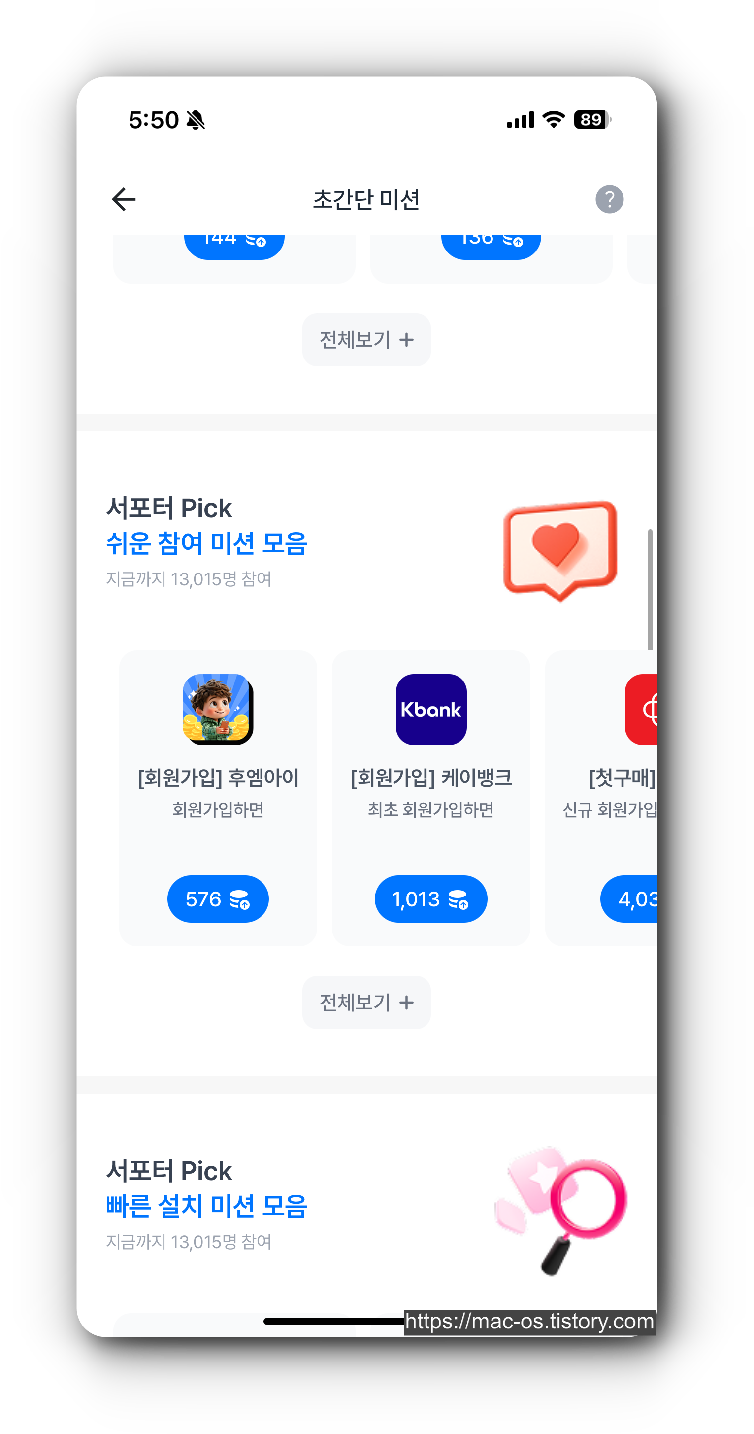 초간단 미션 페이지에서 빠른 설치 미션 모음을 살펴보면 앱 설치, 최초 오픈, 앱 오픈 등의 미션을 하고 평균 130~140포인트를 받을 수 있습니다.