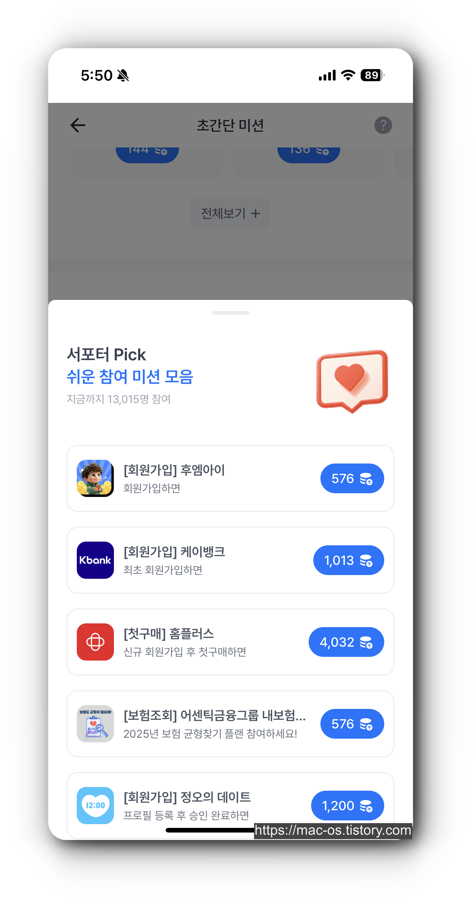 초간단 미션 페이지에서 쉬운 참여 미션 모음을 살펴보면 회원가입, 첫구매, 보험조회 등의 미션을 하고 평균 500~1500포인트를 받을 수 있습니다.