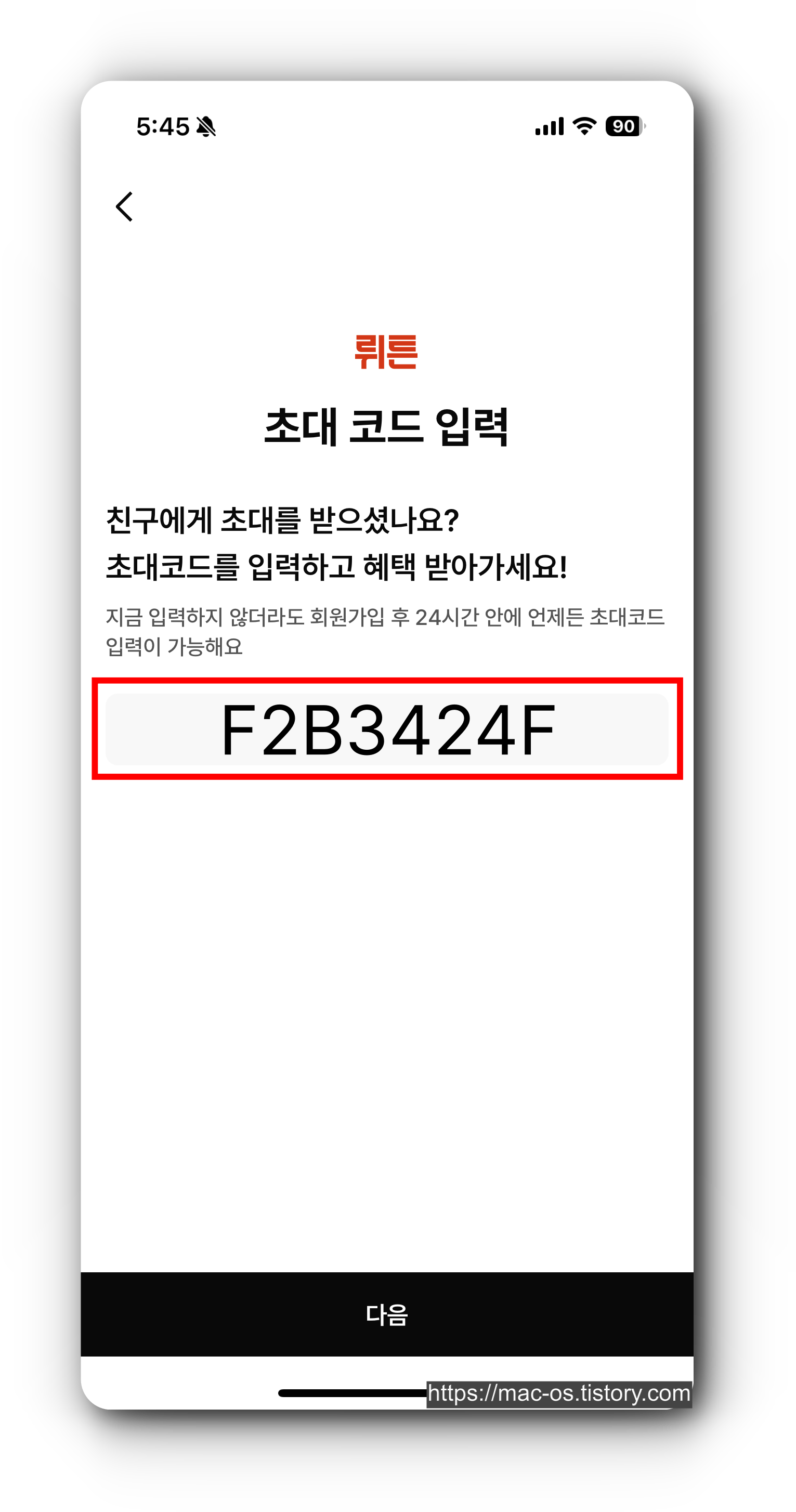 비밀번호 설정을 마치면 뤼튼 초대코드 입력 페이지가 나타나는데 여기서 F2B3424F를 복붙해서 입력하시면 500포인트를 받으실 수 있습니다. 만약 초대코드를 입력하지 않으면 500포인트를 못받는거라 입력하는게 좋습니다.