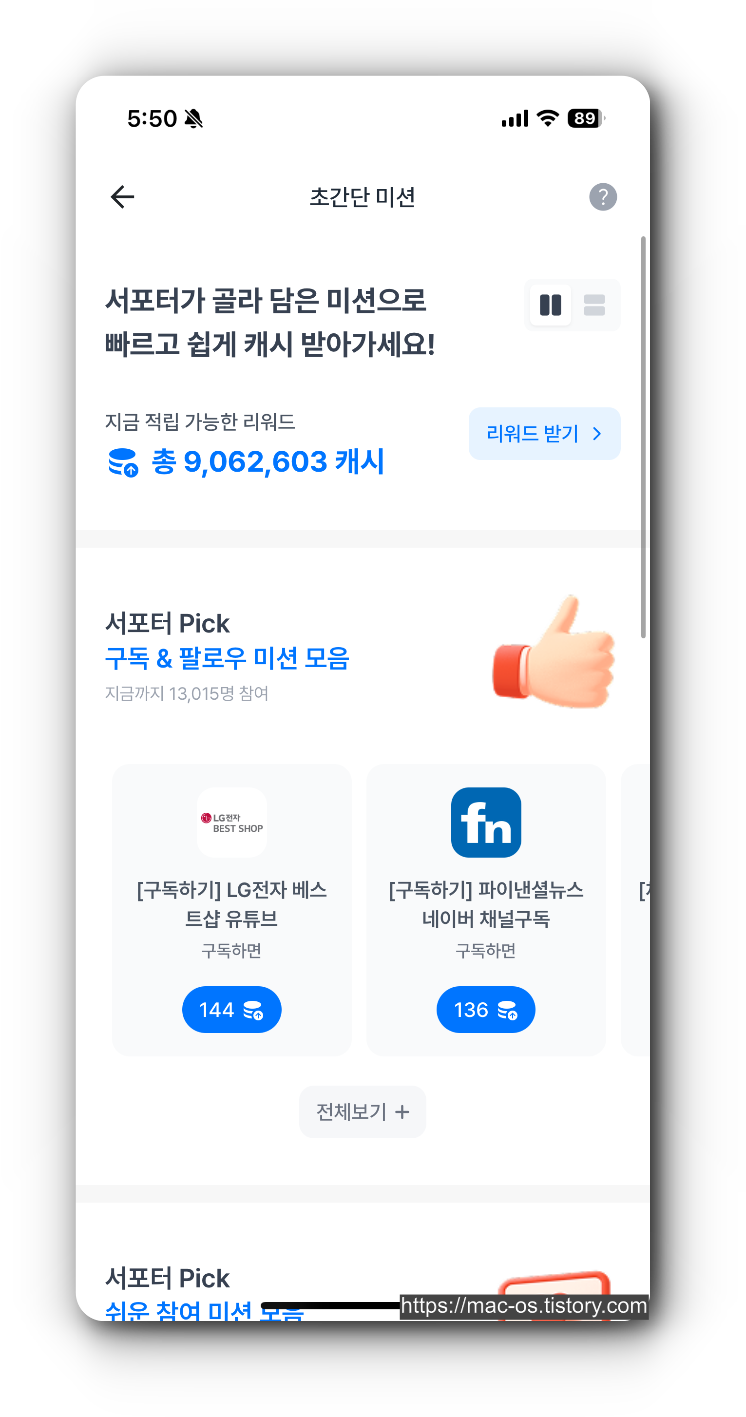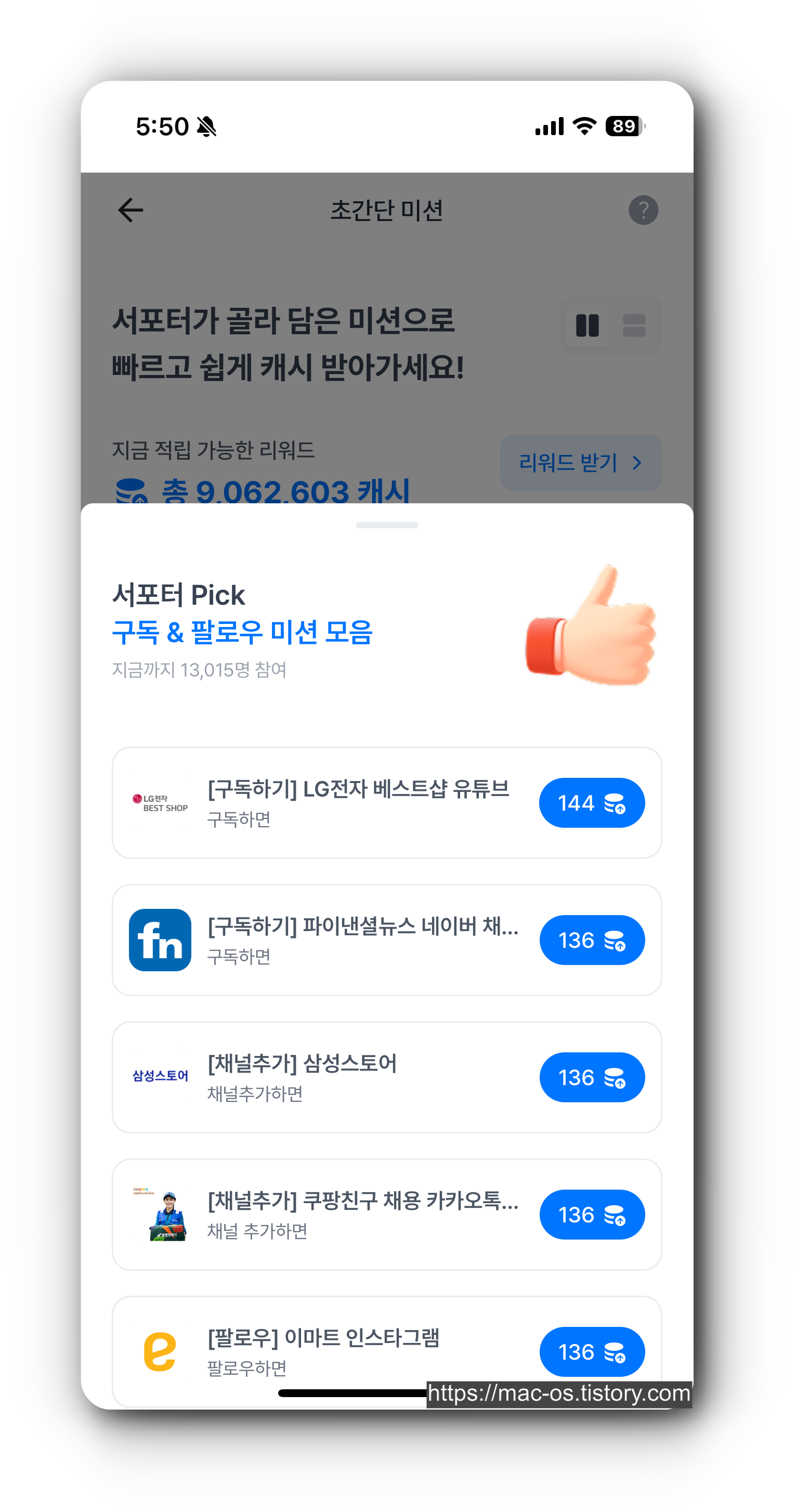 초간단 미션 페이지에서 구독&팔로우 미션 모음을 살펴보면 유튜브 구독, 채널추가, 팔로우 등의 미션을 하고 평균 130~140포인트를 받을 수 있습니다.