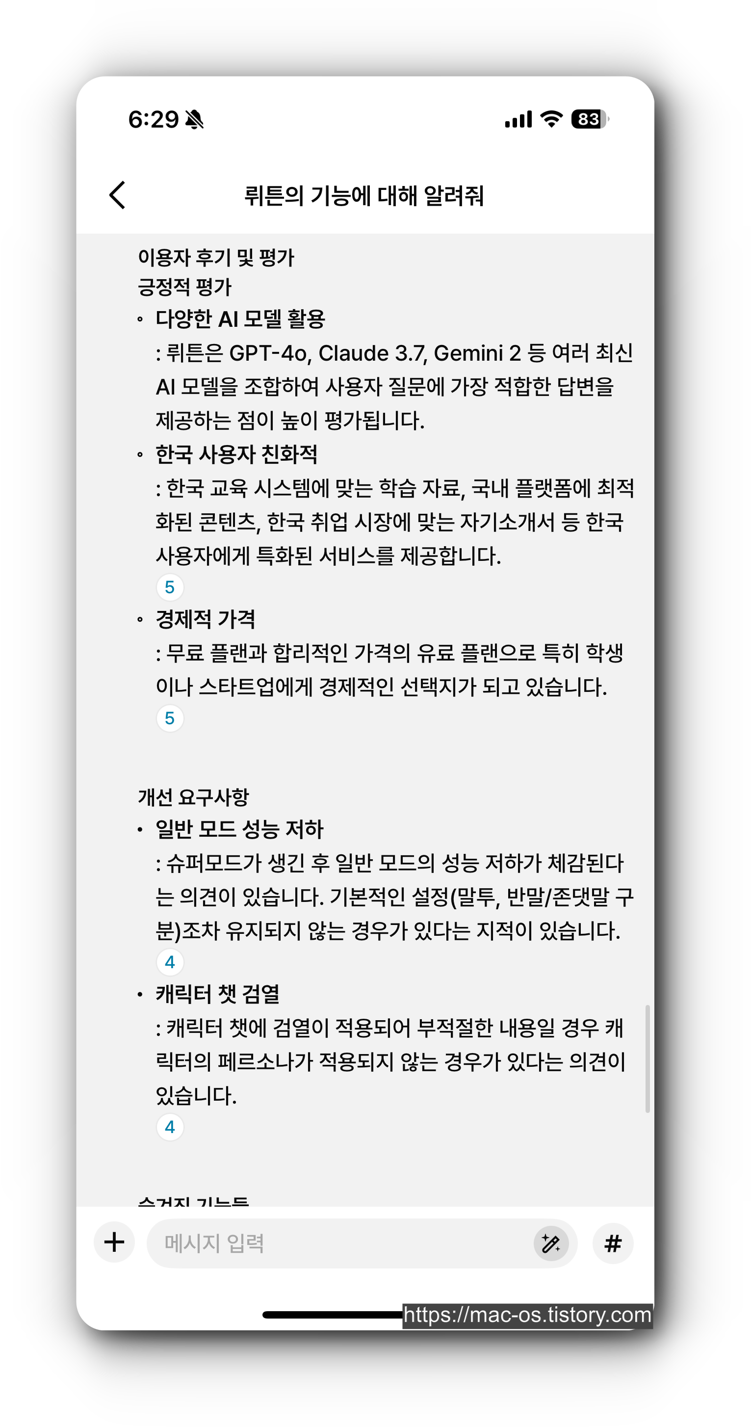 3번째 사진을 보면 뤼튼이 답변을 하다가 도중에 답변을 중지하는 현상이 발생합니다. 이건 Claude 같은 생성형 ai가 출력을 많이 할 때 발생하는 현상과 유사한데 여기서도 동일한 현상이 발생하네요.