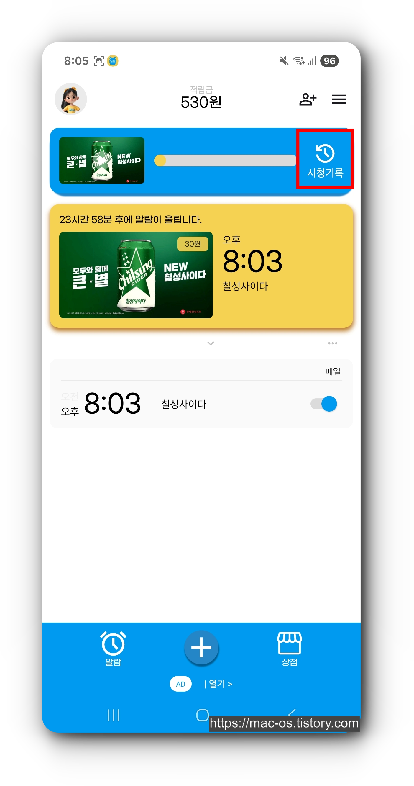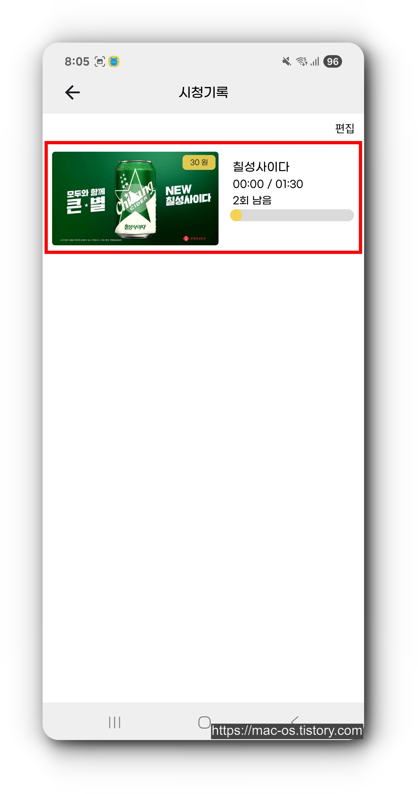 광고 영상을 계속 켜두고 1분 30초가 다 지나면 알아서 포인트가 적립됩니다. 이렇게 1번 시청할 때마다 30원이 적립되는데요. 오른쪽 상단의 [시청기록] 버튼을 눌러보면 아까 1번 시청한 광고를 확인할 수 있습니다.